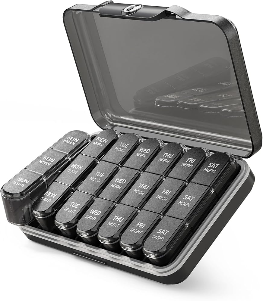 • سعة كبيرة وقابلة للحمل: يتميز منظم حبوب الدواء الخاص بنا 3 مرات يوميًا بـ 7 صناديق يومية مستقلة لتخطيط حبوب الدواء لمدة أسبوع. تحتوي كل حجرة بسهولة على 7 زيت سمك أو 12 فيتامينًا. مثالي للنزهات اليومية والرحلات القصيرة، يمكنك فقط اصطحاب منظم حبوب الدواء اليومي المطلوب بدلاً من صندوق حبوب الدواء الأسبوعي بالكامل، مما يقلل بشكل كبير من وزن الحمل.