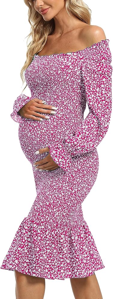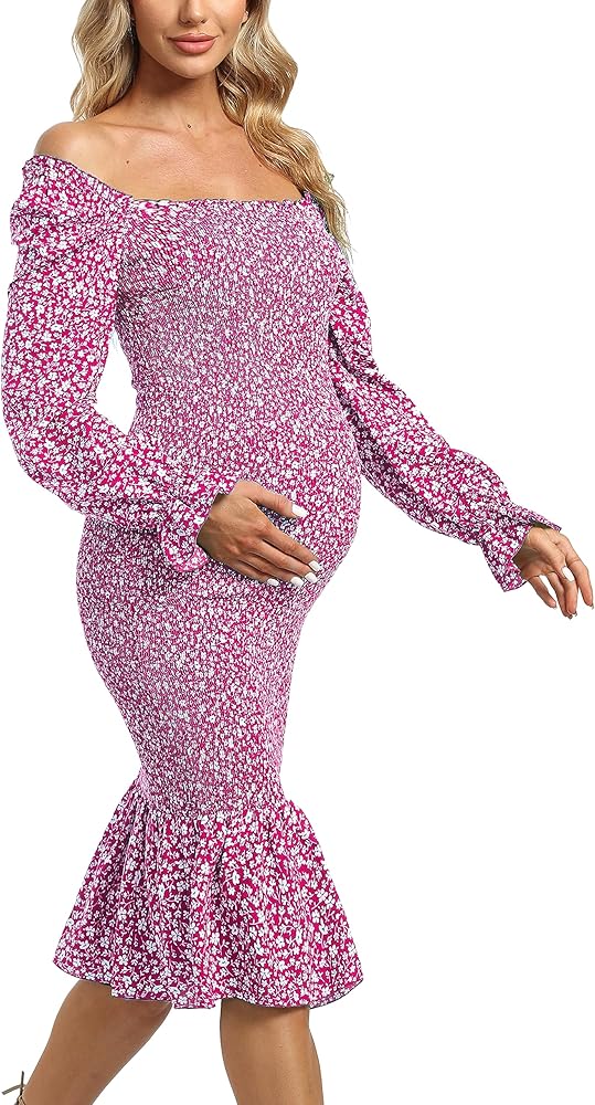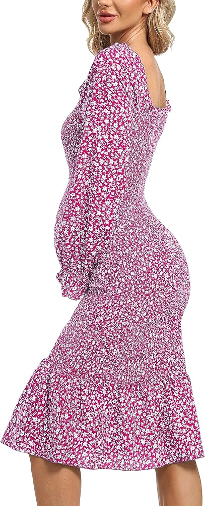 تصميم أنيق - فستان ضيق للحوامل، رقبة مربعة، أكمام طويلة منتفخة، حاشية مكشكشة على شكل حورية البحر، تصميم زهور، نمط شاطئ بوهو، خصر إمبراطوري، فستان أمومة بمقاس متوسط.
