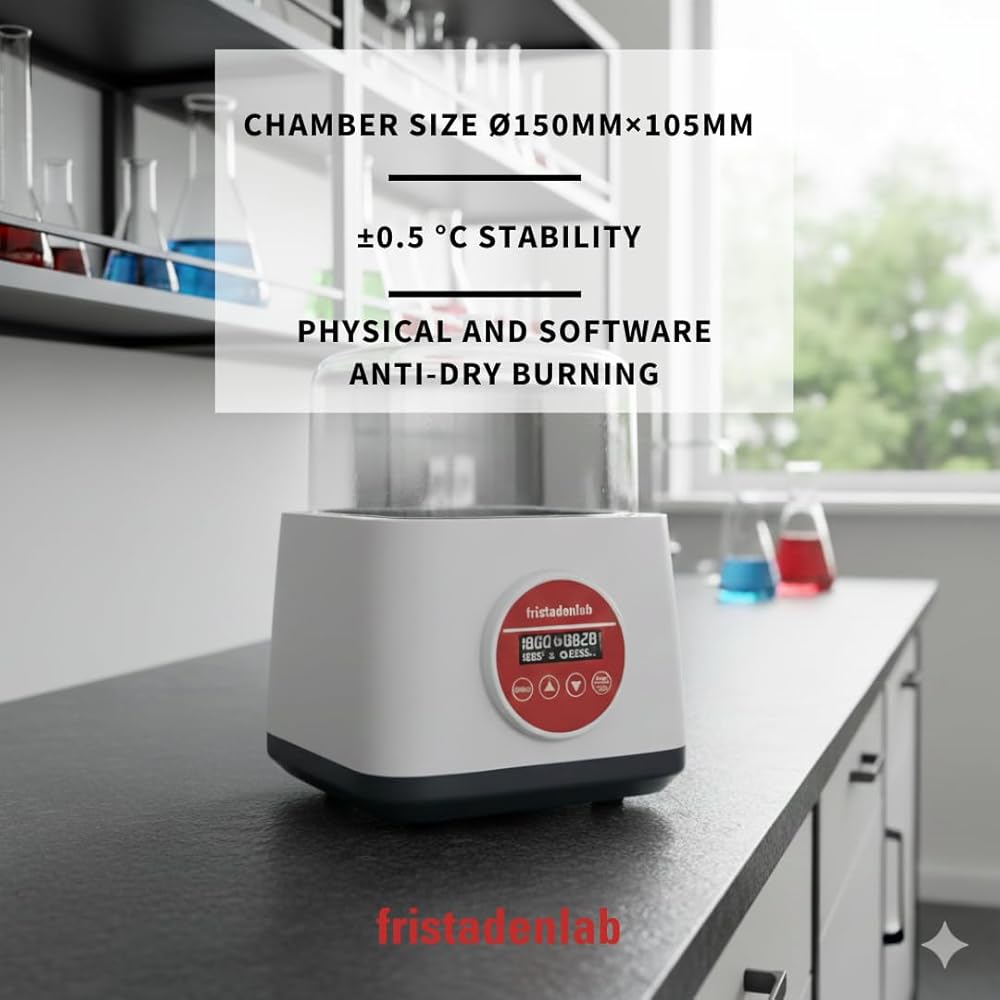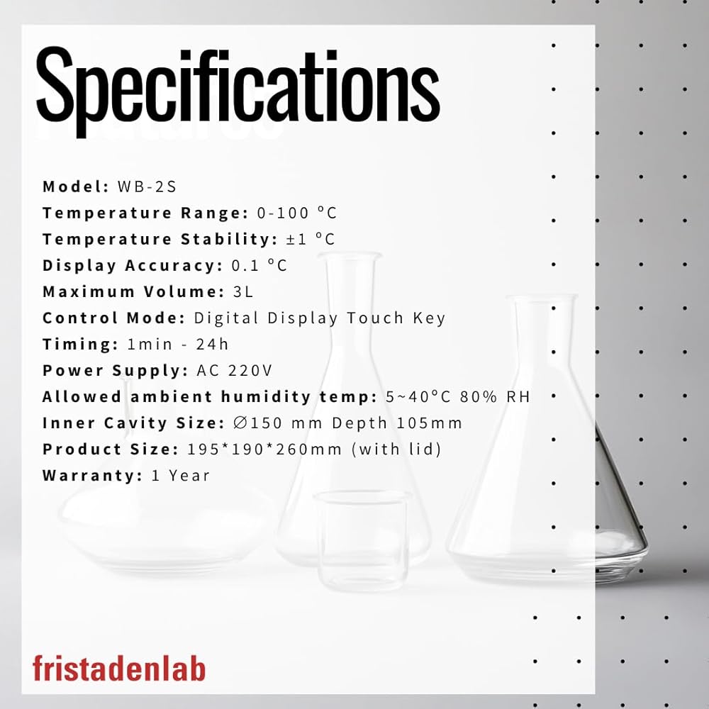 The Fristaden Digital Thermostatic Water Bath with magnetic stirrer features a spacious 2 Liter stainless steel chamber designed to maximize usable workspace. This generous volume allows the Digital Water Bath to easily accommodate multiple test tube racks, Erlenmeyer flasks, or beakers simultaneously.