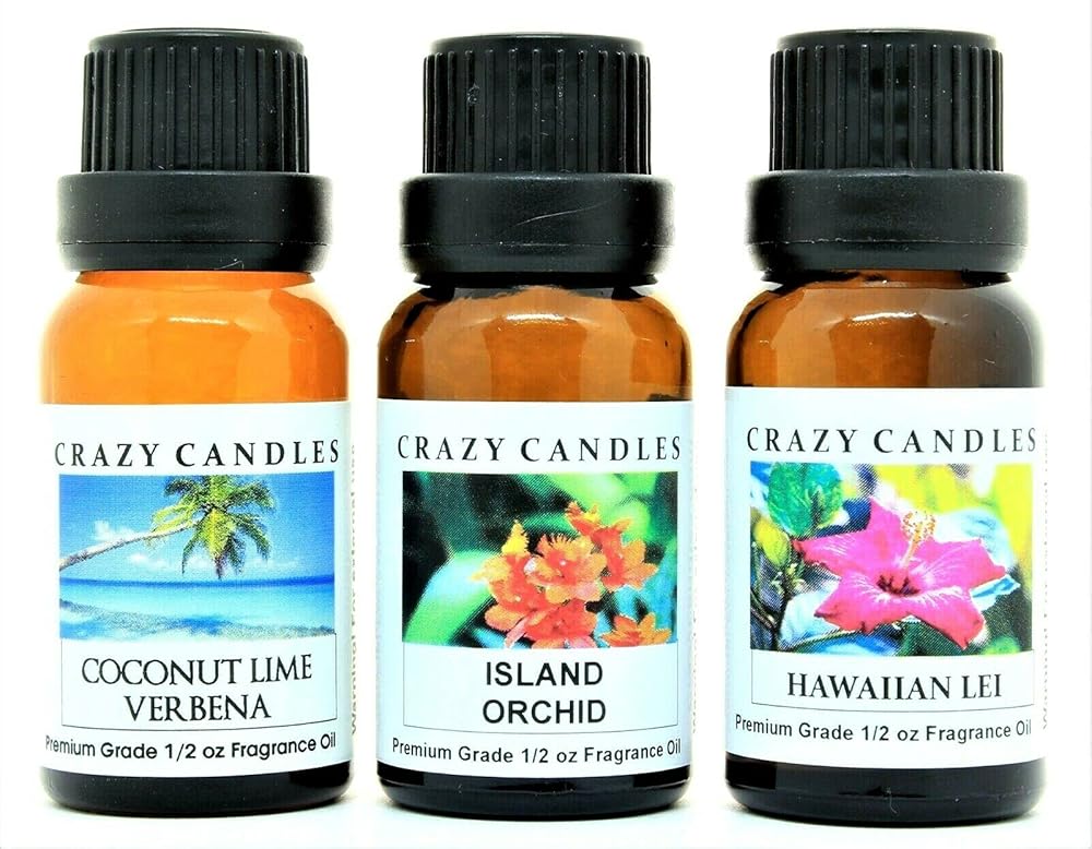 مجموعة 3 زجاجات من كريزي كاندلز، 1 لويزة جوز الهند والليمون، 1 أوركيد الجزيرة، 1 ليو هاواي 1/2 أونصة سائلة لكل منها (15 مل) زيوت عطرية معطرة عالية الجودة
