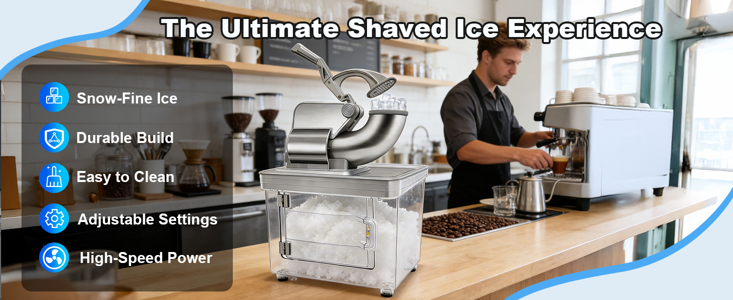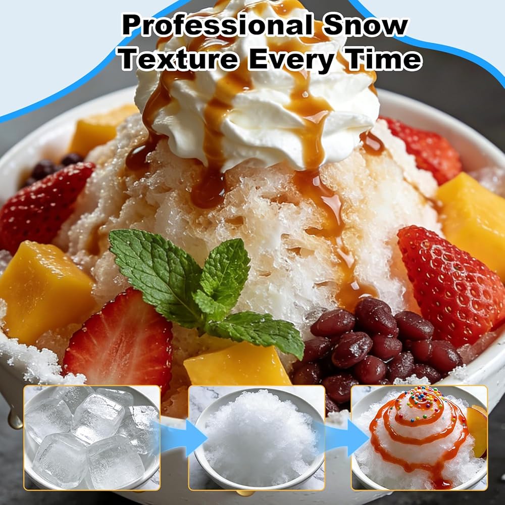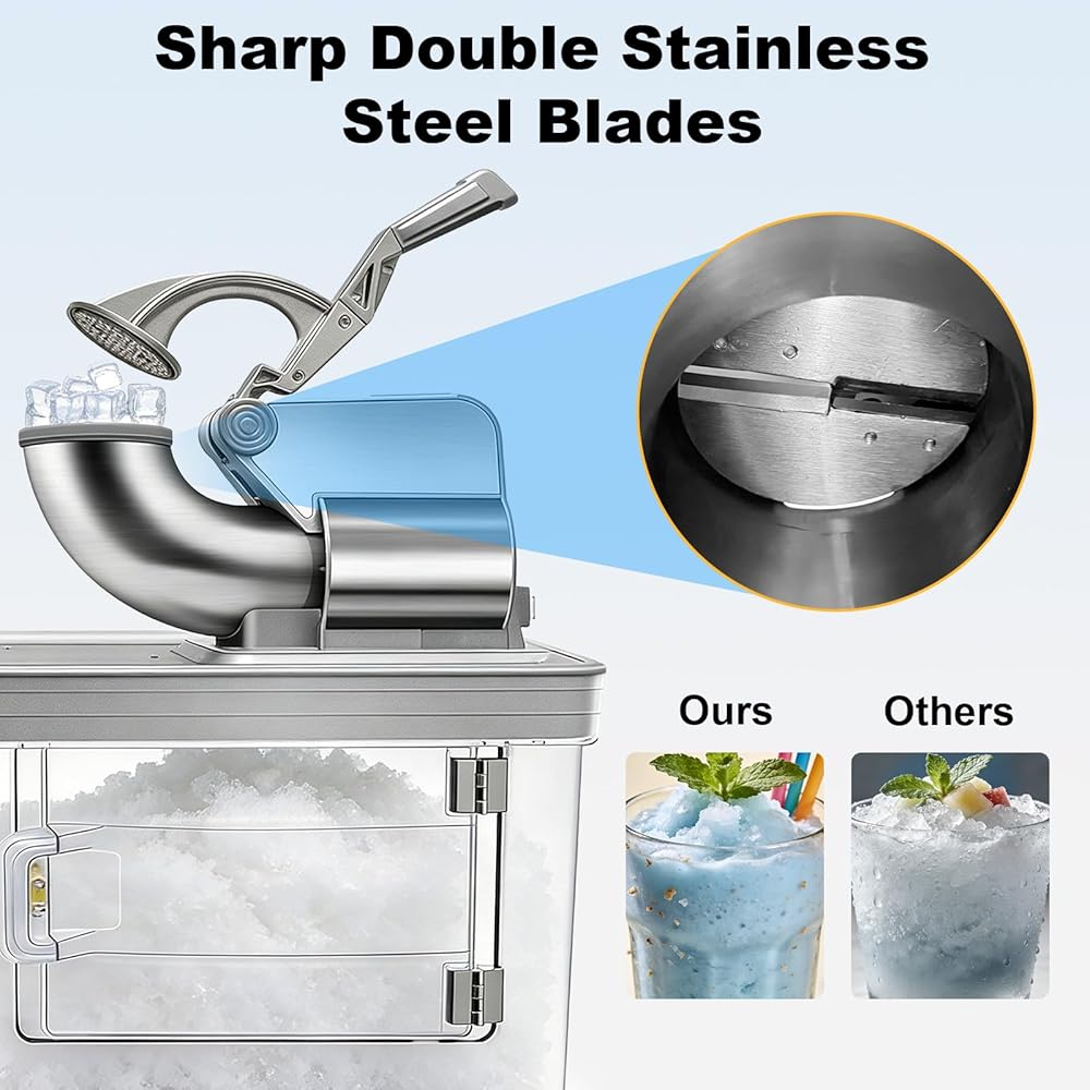 • شفرات مزدوجة للحصول على ملمس ندفة الثلج فائق النعومة: استمتع بتجربة الثلج المحلوق المثالي مع ماكينة حلاقة الثلج التجارية الخاصة بنا. يخلق نظام الشفرات المزدوجة قوامًا سلسًا بشكل استثنائي يشبه الثلج، مما يجعله صانع مخروط الثلج المثالي للحلويات الفاخرة. يعزز هذا الملمس الناعم امتصاص النكهة ويوفر مذاقًا رائعًا سيحبه العملاء.