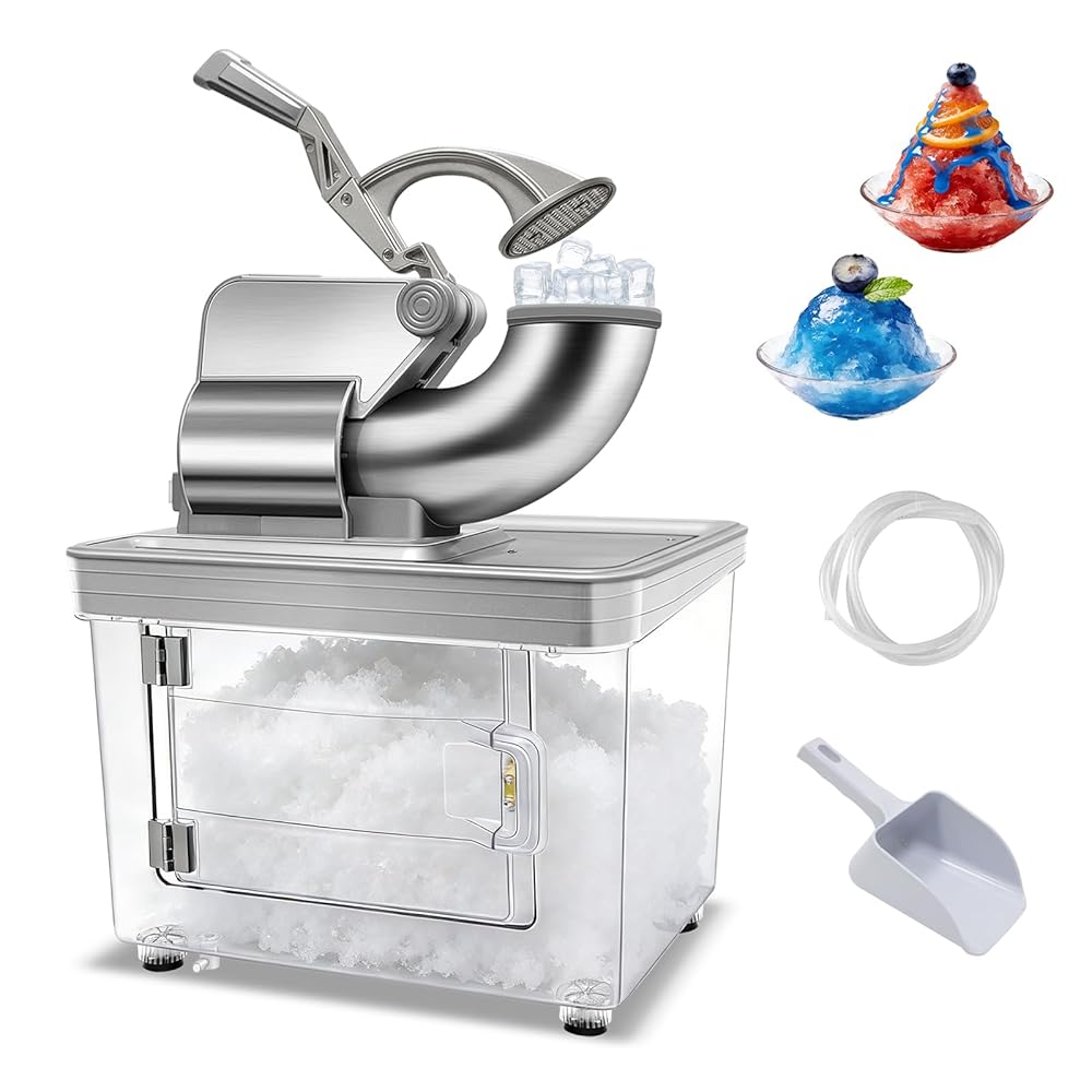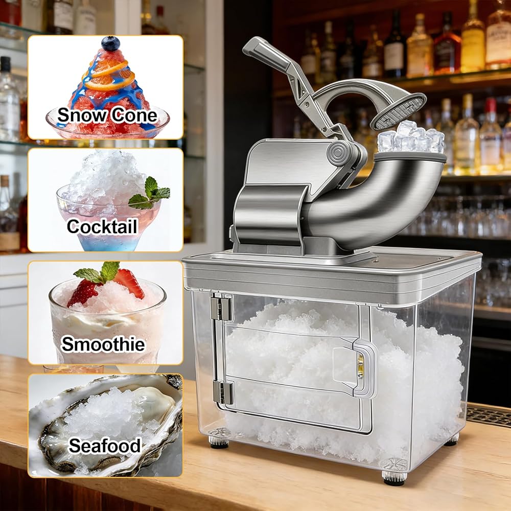 • استخدام متعدد الاستخدامات عبر المشروبات وخدمات الطعام: أكثر من مجرد صانع مخروط الثلج، فإن آلة تكسير الثلج متعددة الاستخدامات هذه تفتح إمكانيات لا حصر لها: اصنع مشروبات السلاش المنعشة، أو خلاطات الكوكتيل، أو أوعية العصائر، أو استخدم الثلج المحلوق لحفظ المأكولات البحرية. إنها ماكينة صنع الثلج التجارية المثالية لإعدادات متنوعة بدءًا من محلات شاي الفقاعات وحتى الحانات والمطاعم.