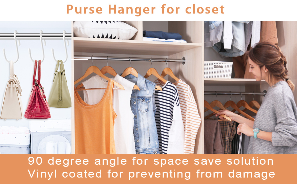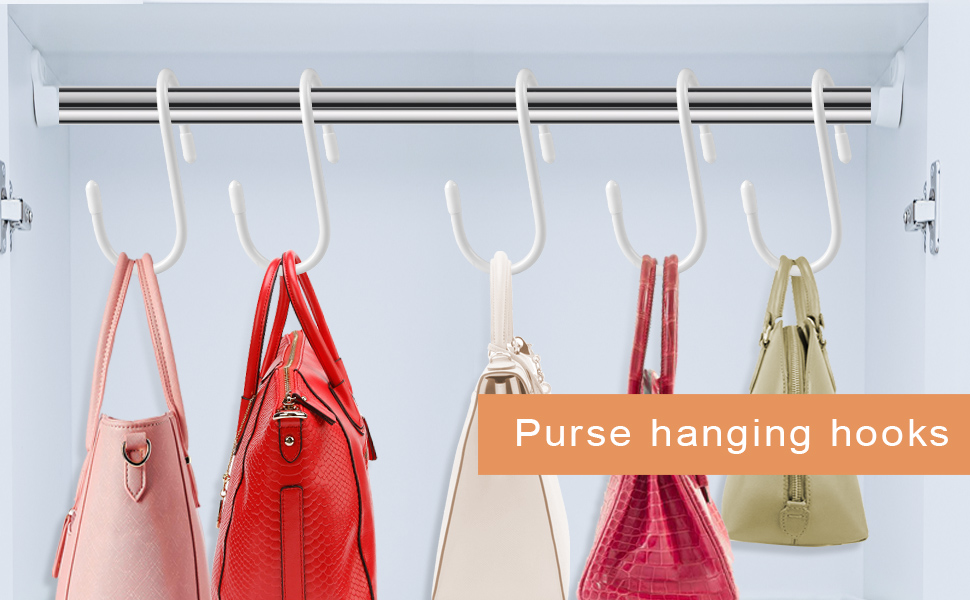 تصميم محسّن على خطافات S العادية: يتم لف خطافات المحفظة الخاصة بنا للخزانة من خطاف S العادي عند الإنتاج، مما يسمح لك بتعليق حقائبك عموديًا في الخزانة، وتوفير المزيد من المساحات، وجعل خزانة ملابسك مرتبة واختيار الحقائب أكثر ملاءمة.