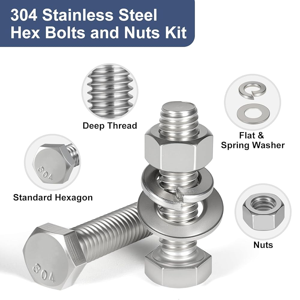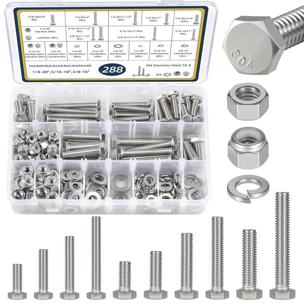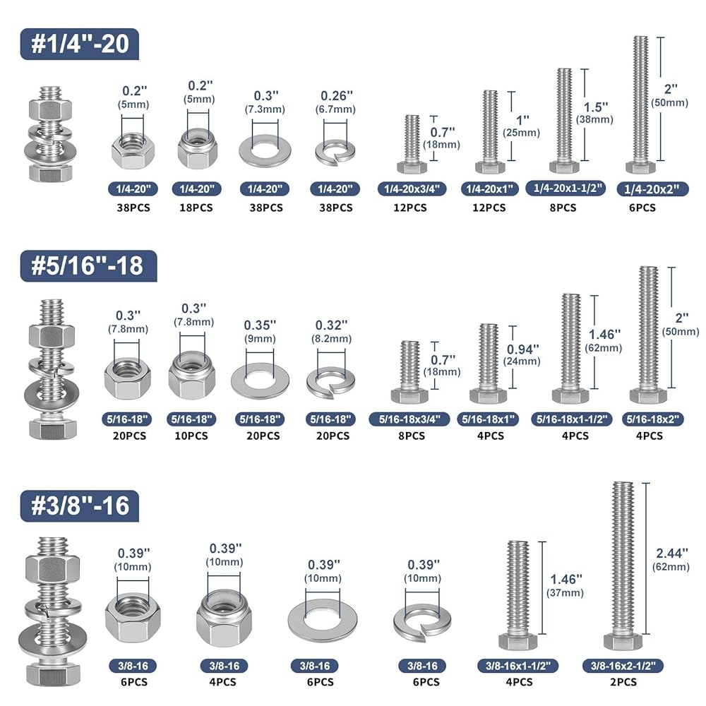 العبوة: يمكنك الحصول على 288 قطعة من براغي سداسية الرأس، تلبي مواصفات ANSI B18.2.1، طول 1/4-20 من 3/4 بوصة إلى 1-1/2 بوصة، و5/16-18 طول 3/4 بوصة إلى 2 بوصة، وطول 3/8-16 من 1-1/2 بوصة إلى 2-1/2 بوصة، مما يضمن التوافق مع الأدوات القياسية.
