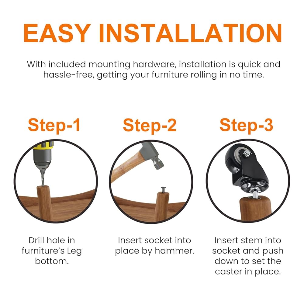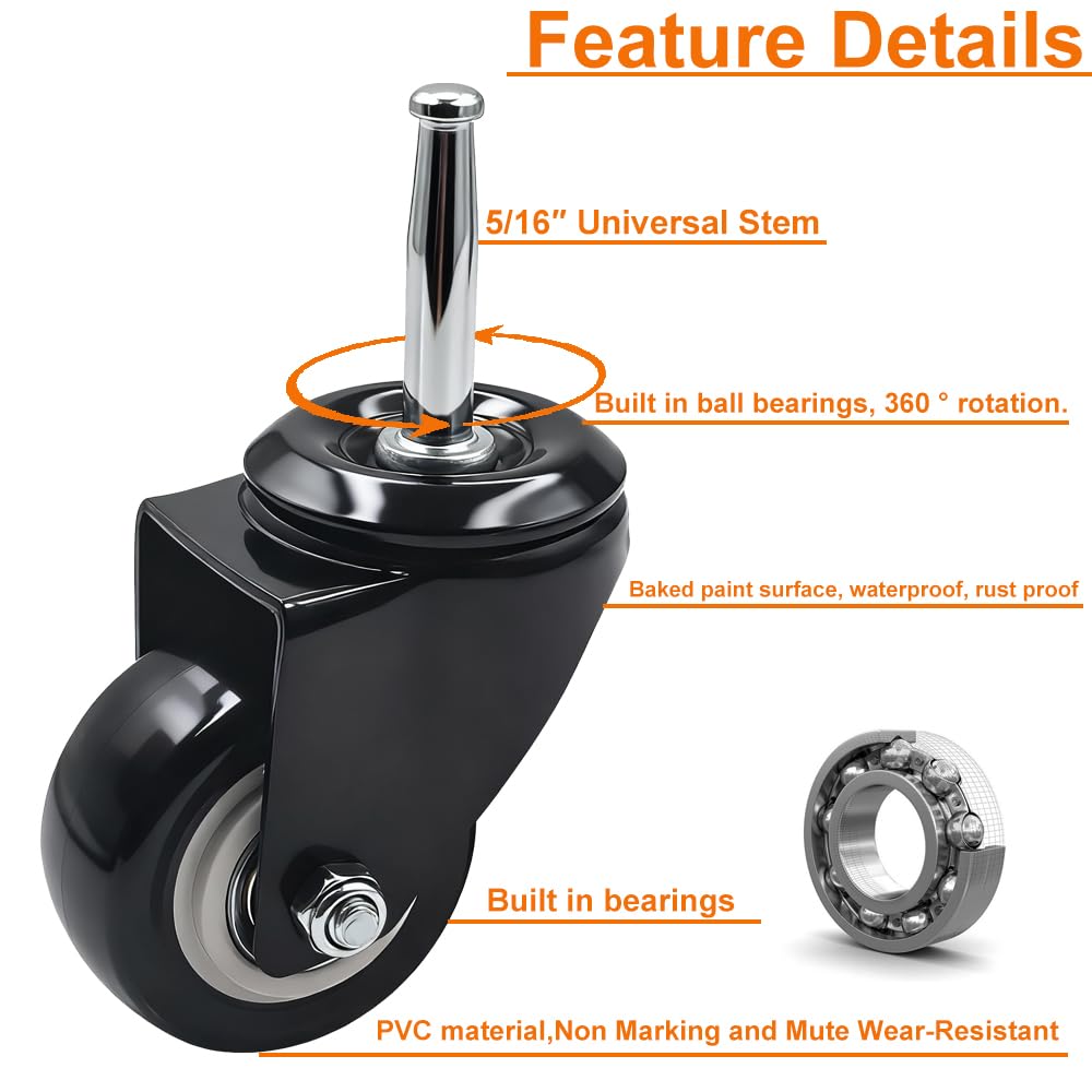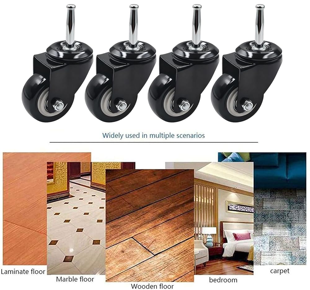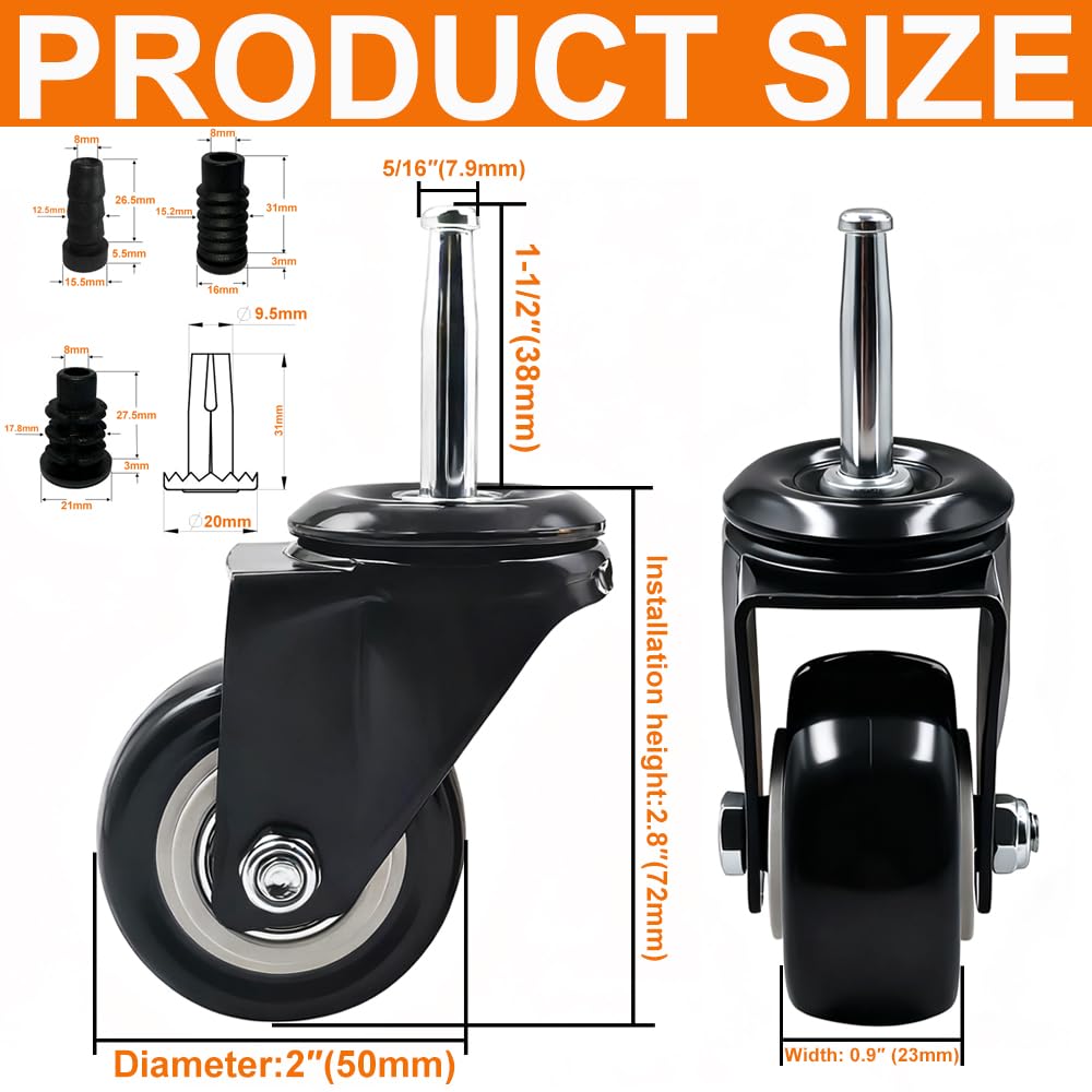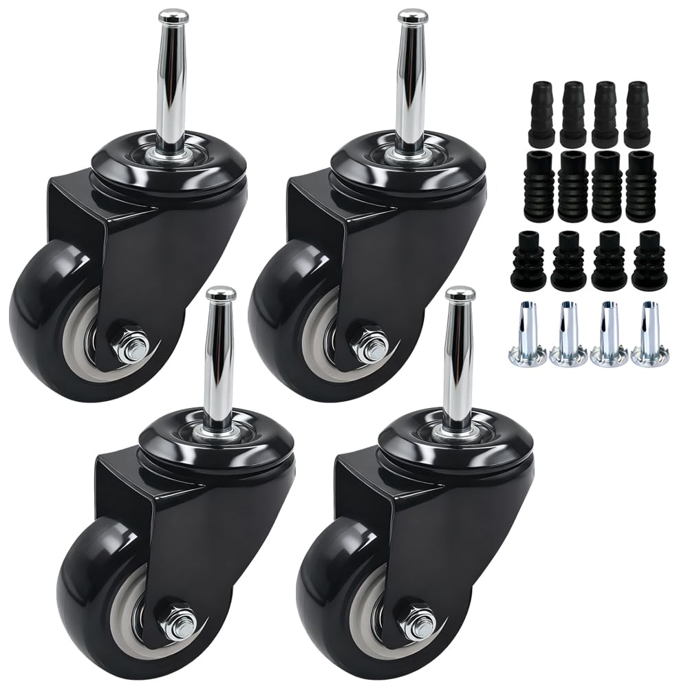 Upgrade your furniture with the QAVBFA 2 Inch Stem Casters Wheels – a reliable, smooth-rolling solution designed for both function and durability. These 5/16"" x 1-1/2"" stem casters are built with a heavy-duty steel core and PVC wheels that roll quietly without leaving marks, making them perfect for home or office furniture. Each caster is engineered to support up to 44 lbs, with a total capacity of 177 lbs across the set of 4—ideal for cabinets, cribs, trolleys, and dining carts. The precision ball bearings ensure effortless movement while protecting your floors from scratches and wear. This complete set includes 4 caster wheels, 4 iron sockets, and 8 plastic sockets (14mm and 19mm), giving you the flexibility to install them on various types of furniture. Whether you're upgrading a wooden chair, a rolling cart, or a plant stand, QAVBFA furniture casters offer a perfect blend of strength, stability, and style. Choose QAVBFA for your replacement furniture casters and enjoy smooth, silent, and sturdy mobility today!
