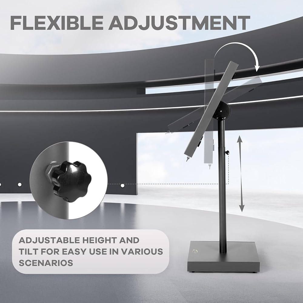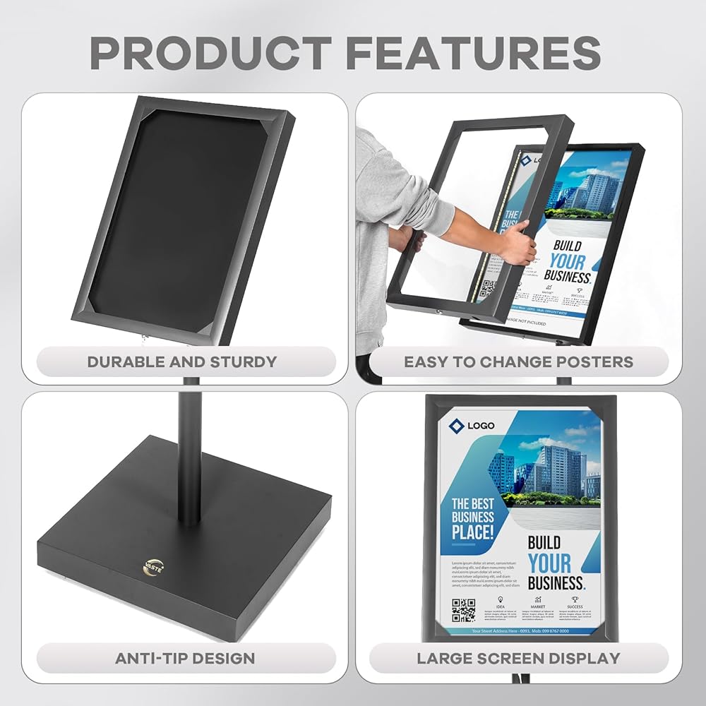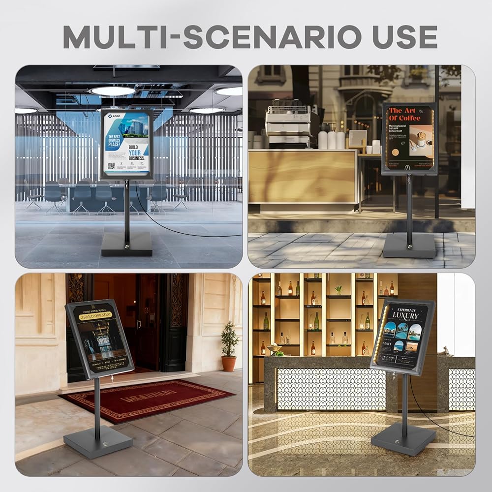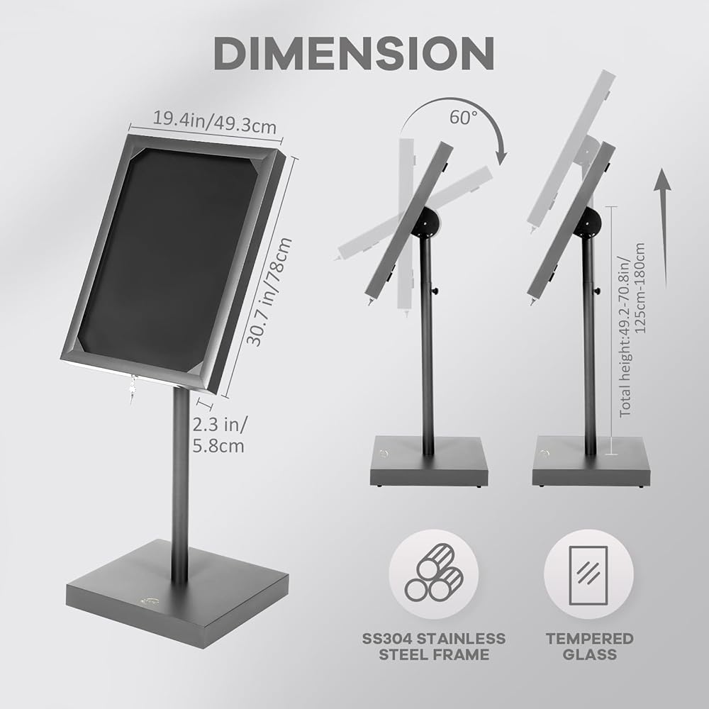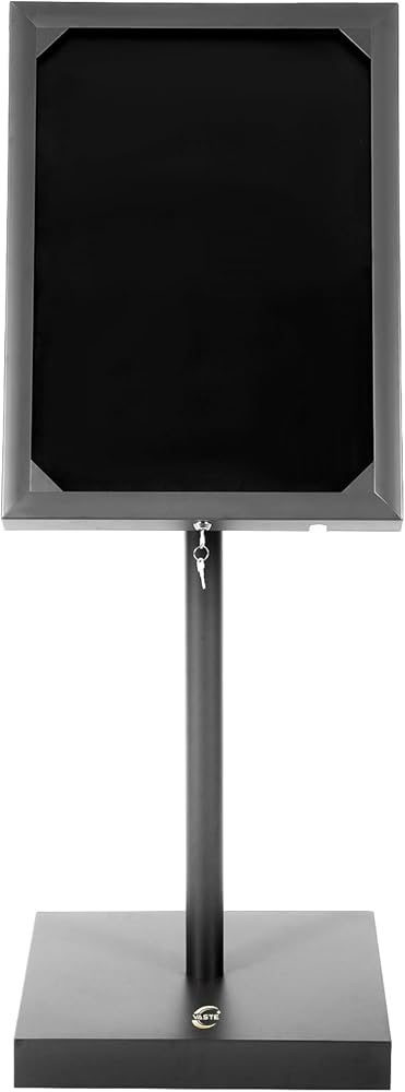 تعرض قائمة Vaste الفولاذية الكبيرة شاشة عرض إعلانية بحامل قائم على الأرض قابلة للتعديل مع غطاء وقاعدة شديدة التحمل وأقفال أضواء LED لمراكز التسوق والمطاعم والمؤتمرات والمعارض (أسود)