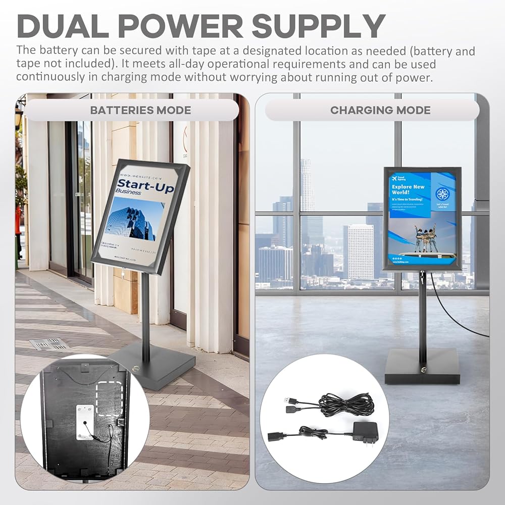 【طريقتان للاستخدام】يمكن استخدام حامل اللافتة القائم على الأرض بحامل الملصقات LED عن طريق التوصيل أو الشحن. يمكنك الاختيار بين الطريقتين. يمكن لبطارية الليثيوم ذات السعة الكبيرة أن تدوم لمدة 10 ساعات ويمكن شحنها لمدة 4 ساعات، حتى تتمكن من مواصلة عملك طوال اليوم. يمكن أن تلبي طريقة المكونات الإضافية الاستخدام طويل الأمد دون القلق بشأن نفاد الطاقة.