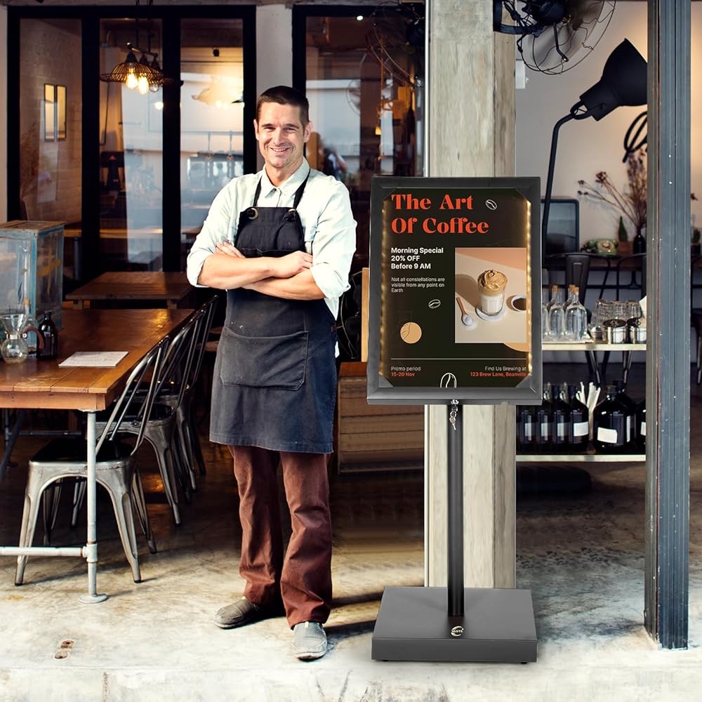 【تغيير الملصقات بسهولة】يسمح التصميم خفيف الوزن للوحة العرض LED الخاصة بنا بإجراء تحديثات سريعة وسهلة لإعلاناتك. ما عليك سوى إخراج الملصق القديم واستبداله بآخر جديد. يضمن إطار الصورة المضيء هذا أن تظل اتصالاتك المرئية جديدة وذات صلة وجذابة، مما يجعله مثاليًا للمطاعم والحانات والمحلات التجارية.