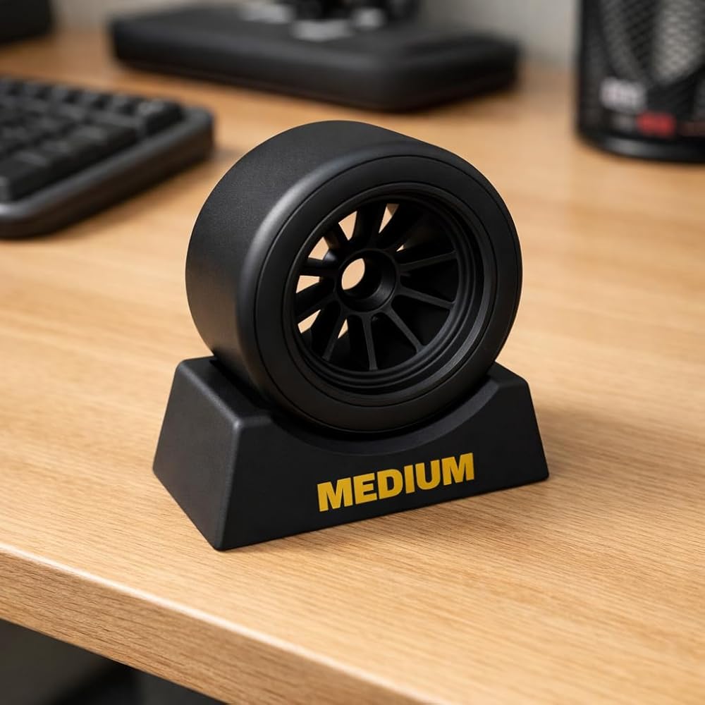 Bring the thrill of Formula 1 racing to your workspace with this stunning medium compound F1 tire replica. This meticulously crafted desk display features authentic racing tire details, from the sleek black finish to the distinctive tread pattern and multi-spoke wheel design. The model sits perfectly on its custom stand marked with 'MEDIUM' in bold yellow lettering, making it an eye-catching conversation piece for any office, desk, or display shelf. Perfect for motorsport enthusiasts and F1 fans, this miniature wheel model captures the essence of high-performance racing while adding a sophisticated touch to your decor. The compact size makes it ideal for desktop placement, while the robust construction ensures lasting quality. Whether you're a dedicated racing fan or looking for a unique automotive-themed gift, this F1 tire replica serves as an inspiring reminder of the precision and engineering excellence that defines Formula 1 racing.