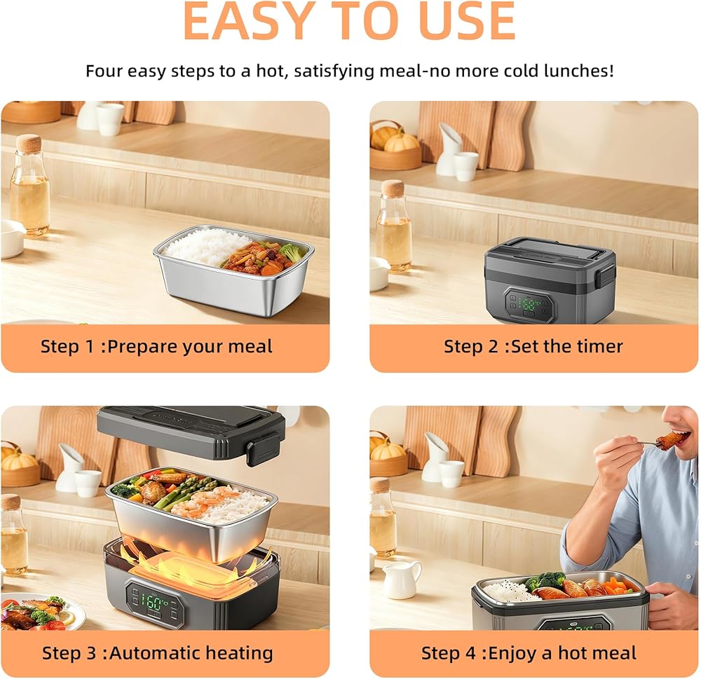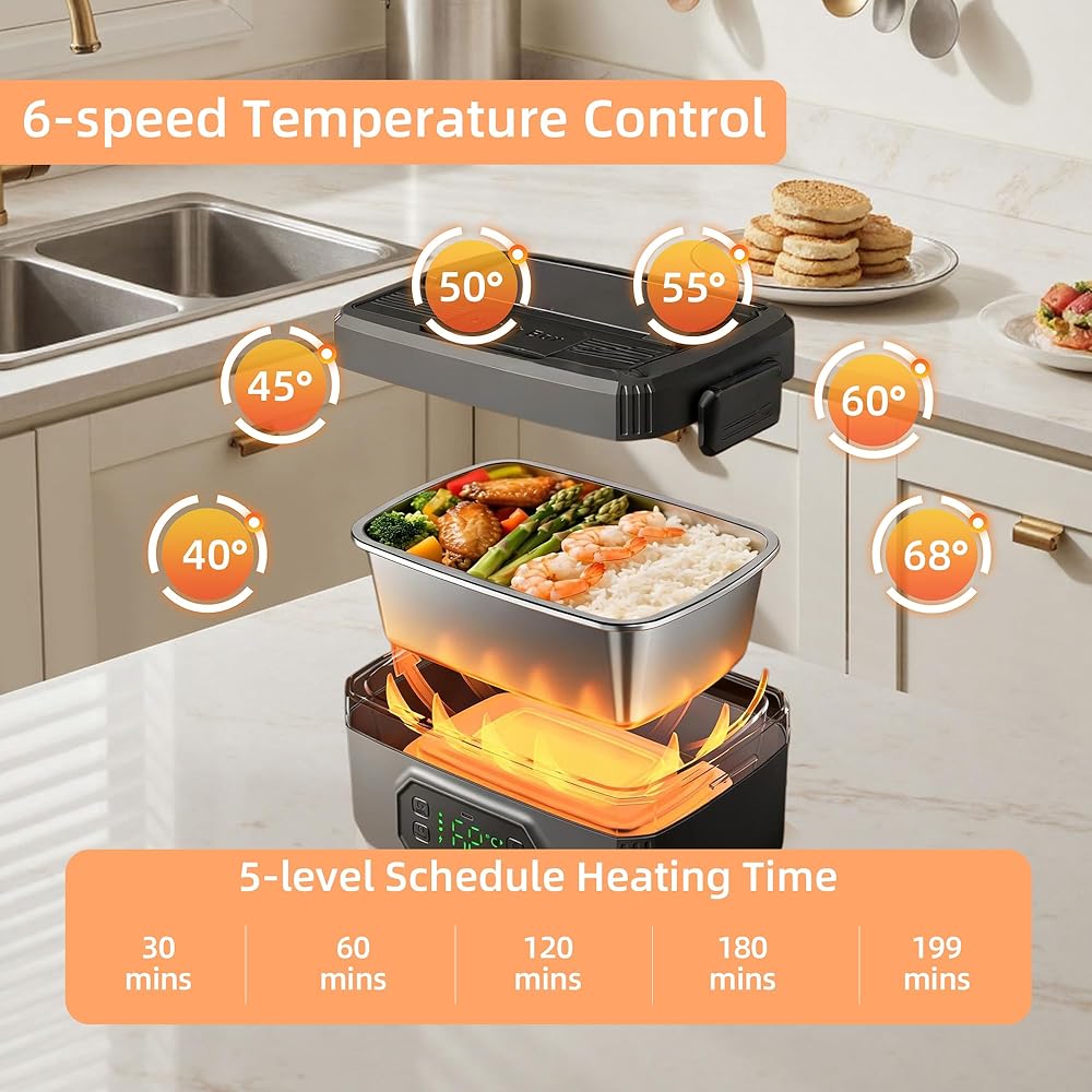 • 【مؤقت ذكي وتحكم في درجة الحرارة بـ 5 مستويات】قم بتخصيص وقت وجبتك بدقة. يوفر صندوق الغداء الكهربائي هذا 5 إعدادات لدرجة الحرارة (40 درجة مئوية إلى 68 درجة مئوية) ومؤقت من 9 مستويات (20-100 دقيقة). تضمن وظيفة الحجز المبتكرة (30-199 دقيقة) أن يبدأ طعامك في التسخين تلقائيًا، بحيث يكون غداءك الساخن جاهزًا تمامًا عندما تبدأ استراحتك.