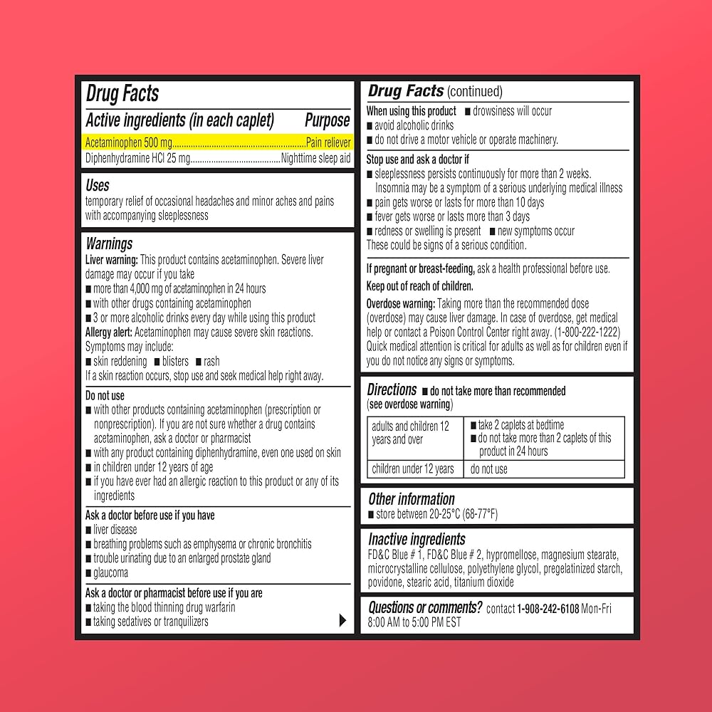 • تعزيز النوم المريح: قل وداعًا لليالي الطوال مع مسكن الألم الذي يساعد على النوم أثناء الليل (500 مجم أسيتامينوفين، 25 مجم ديفينهيدرامين حمض الهيدروكلوريك). يساعدك على الاسترخاء والانجراف إلى نوم هادئ، مما يسمح لك بالاستيقاظ منتعشًا ومتجددًا. استمتع بالفوائد المزدوجة لتخفيف الألم والنوم الجيد أثناء الليل.
