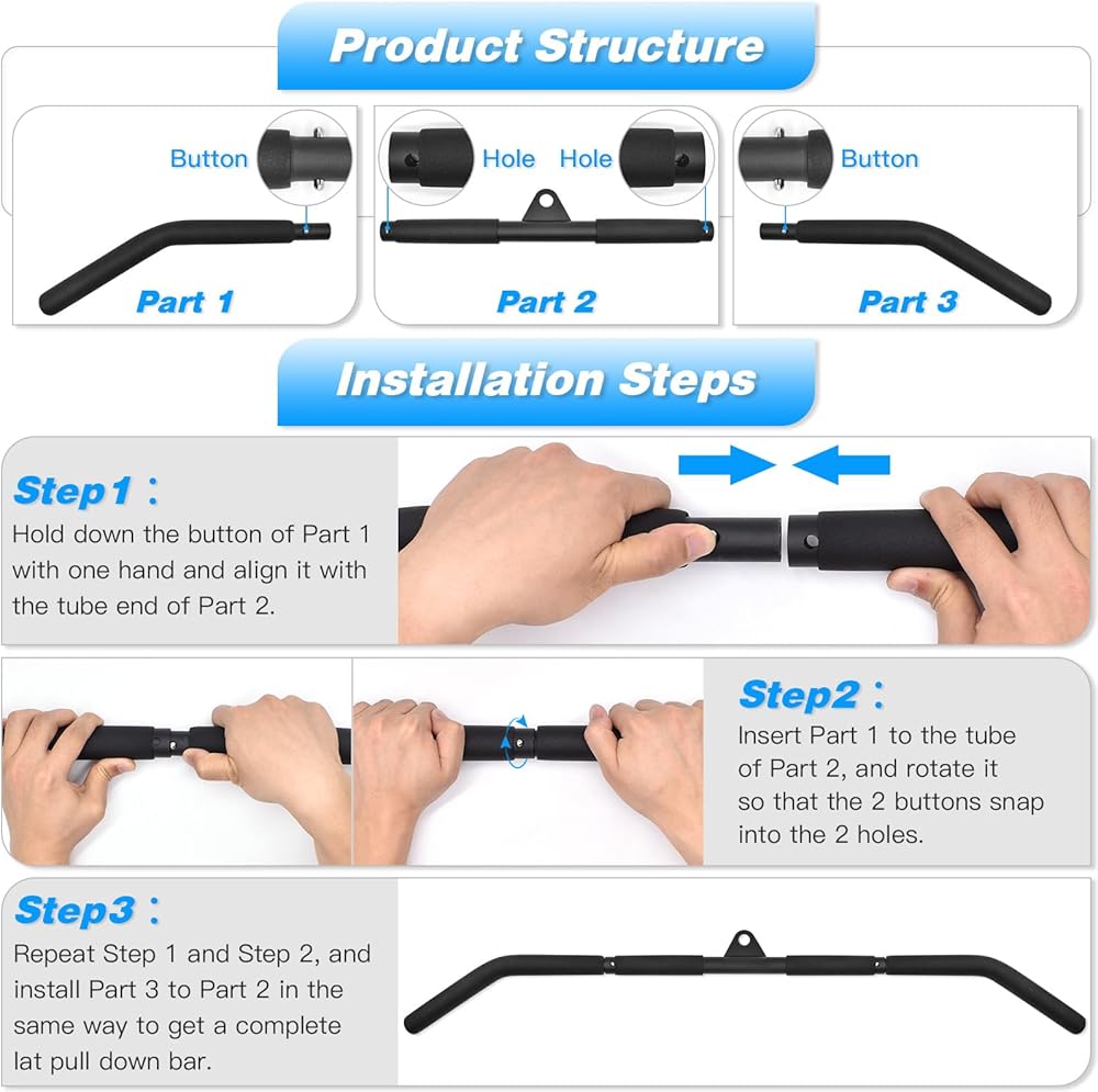 💪【قضيب صالة الألعاب الرياضية الاحترافي】 يحتوي على 3 أجزاء مع وضعين: شريط طويل (39.37 بوصة) وشريط قصير (15.7 بوصة). الشريط الطويل: إكمال حركات مثل السحب لأسفل يمكن أن تمرين عضلات الظهر والكتف. شريط قصير: مناسب للرفع والتجديف وتقوية عضلات العضلة ذات الرأسين والعضلة ثلاثية الرؤوس وعضلات البطن.