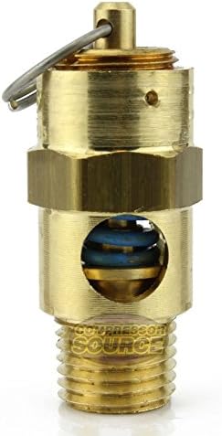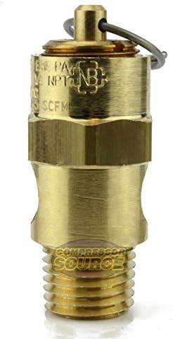 Brand new, certified 1/4" male NPT 75 PSI Industrial air compressor / tank pressure safety relief valve. Also known as a "Pop Off" or "Blow Off" valve. This relief valve is manufactured in the United States and is stamped with "UV" & "NB" symbols. The relief pressure of this valve is set at 75 PSI and is accurate within + or - 3% of the set pressure. Specifications: This valve will relieve 71 SCFM Valve Inlet Threads: 1/4" Male NPT (measure about 1/2" in diameter) Total Valve Length: 1-3/4" Installation Wrench Size: 11/16" Features a silicone rubber soft seat relief valve to prevent leaks Max temperature: 250° F Solid Brass Construction Top quality made in the U.S.A| Manufactured by Conrader