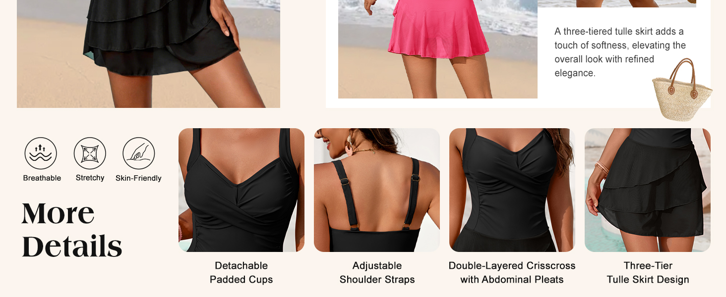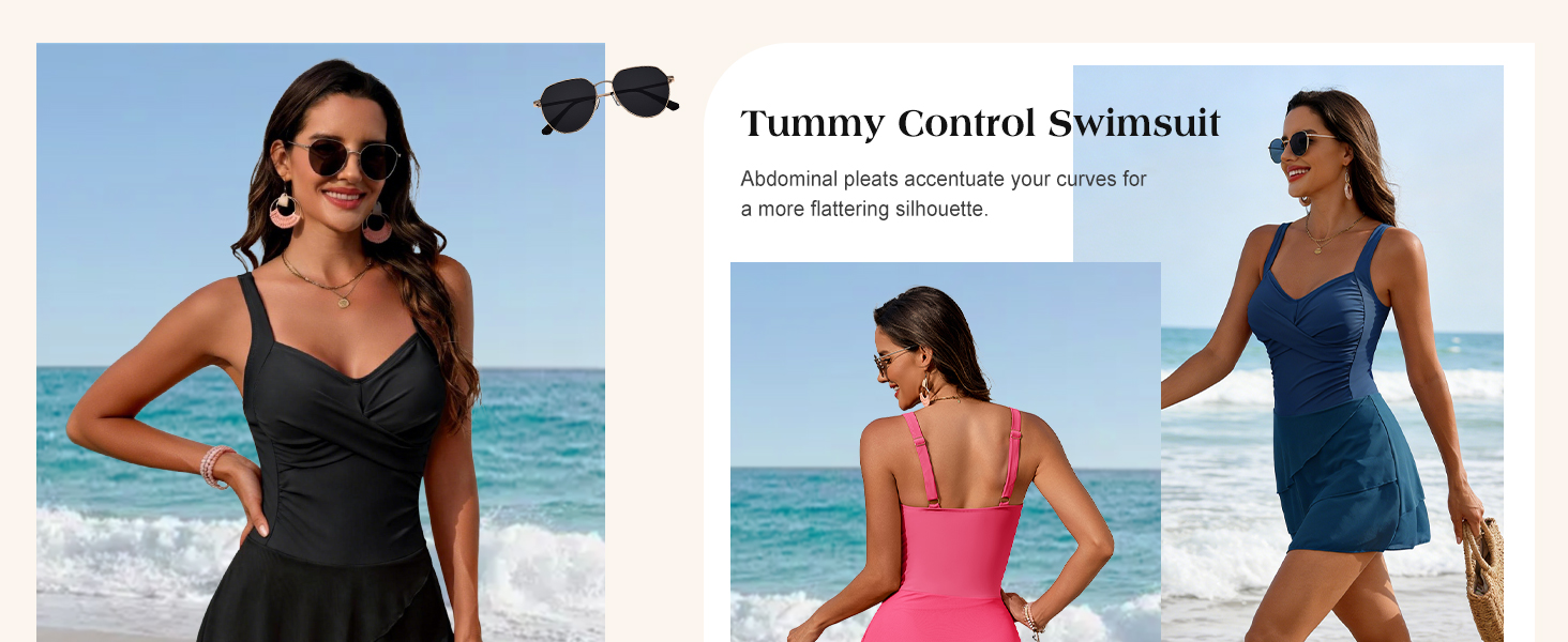 【فستان سباحة مكشكش للتحكم في البطن للنساء】: يتميز الصدر بتصميم متقاطع مزدوج الطبقات، بينما يشتمل خط الخصر على تفاصيل مطوية لإضفاء مظهر جذاب على الجسم وإبراز الانحناءات الجذابة. تضيف تنورة التول ثلاثية الطبقات لمسة من النعومة، مما يرفع المظهر العام بأناقة راقية.