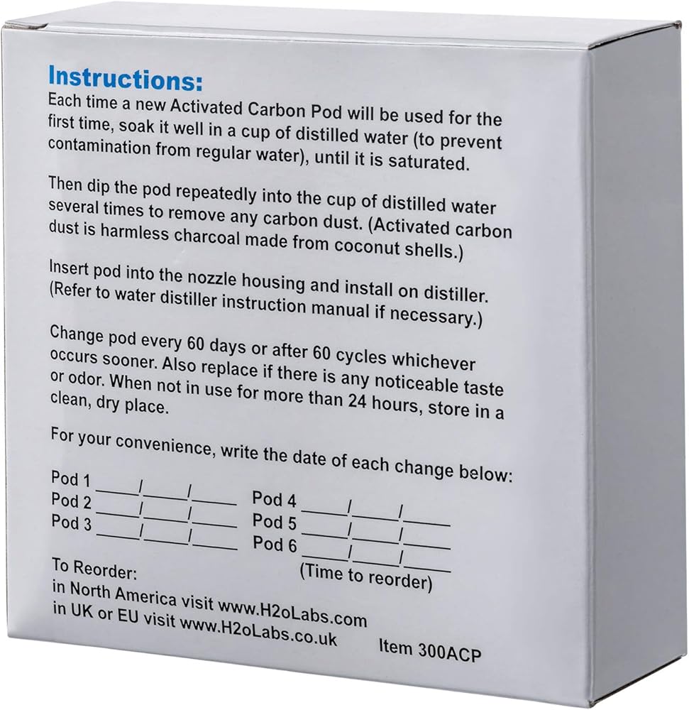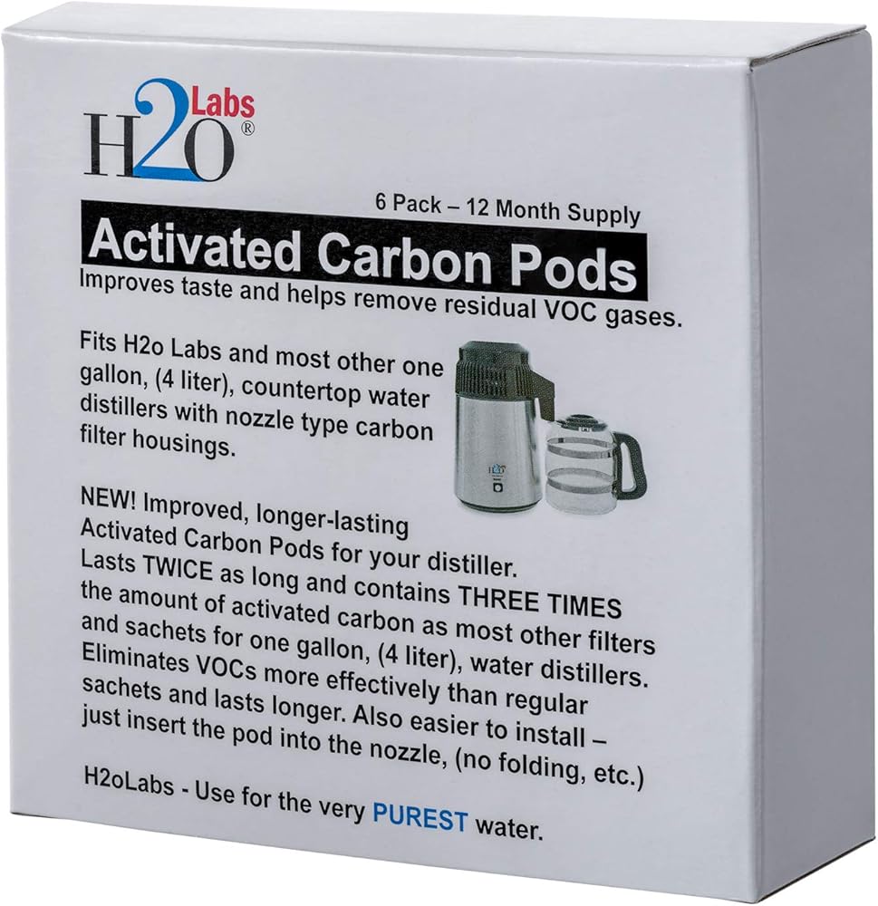 Made from coconut shells. Safely removes any potential residual odor or taste. Also helps remove any remaining VOC gases. For H2oLabs models 100, 100E,100SS, 100SSE, 300, 300E, 300SS, 300SSE, 300SSF and other water distillers with nozzle-type activated carbon filter housings. (Does not fit H2o Labs Model 200.) Eliminates VOCs more effectively than regular sachets and lasts longer. Also easier to install – just drop the pod into the nozzle, (no folding, etc.) Instructions: Each time a new Activated Carbon Pod is to be used for the first time, soak it in a cup of distilled water until it is saturated. (It is recommended to use distilled water in order to prevent contamination from regular water.) Then dip the pod repeatedly into the cup of distilled water several times to remove any carbon dust. (Any activated carbon dust is harmless charcoal made from coconut shells.) Insert the water distiller carbon filter pod into the nozzle housing. Be sure to leave a little space at the bottom so it will not block water from exiting the outlet. The Activated Carbon Pod helps to reduce any discernible taste or residual VOC gases. Replace each Activated Carbon Pod every 2 months or after 60 gallons has been made, whichever occurs sooner. Also replace if there is any noticeable taste or odor. When not in use for more than 24 hours, store in a clean, dry place. (Six-Pack is a year's supply.)