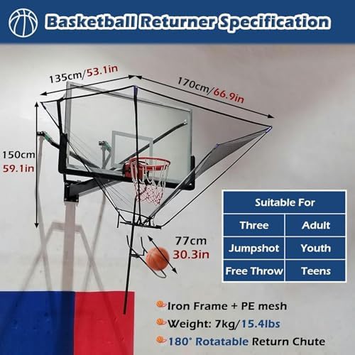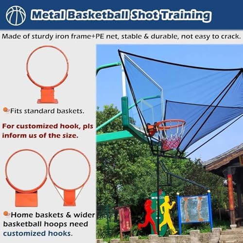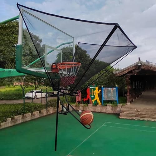 Do you keep chg the basketball while shooting and can't focus on mechanics Do you want to improve your shooting percentage Do you want to get the right arc on your shotWhether you are a beginner in basketball or a professional player who wants to practice his shooting skills our basketball rebounder can be the perfect solution to your problem. Our basketball return attachment catches all shots reduces time spent chg the ball increases shot frequency and effectively improves shooting rate by 2-3x. Specification :- Material: Iron Frame + PE Net- Color: Black- Weight: 7 kg/15.4 lbs- Length: 170 cm/ 66.9 in- Width: 135 cm/ 53.1 in- Height: 150 cm/ 59.1 in Features :- Durable iron frame sturdy & loadbearing HD basket net reduce light refraction and glare.- 180 rotation covering almost all shooting angles on the court.- No need to chase the ball around the gym for missed shots.- Multiply shooting time making shots 80% more efficient.- Instill muscle memory for the correct trajectory of the ball.- Easy to install fits most basketball hoops indoors & outdoors Perfect gift for family friends kids who love basketball Package Includes :1 x Basketball Shot Trainer (Basketball basket not included.) Tips :- If it snows and you don't use it we recommend that you store it indoors during the winter.- Minor errors can be 1-3cm error due to different batches and manual measurements. Thank you for your understanding.- There may be chromatic aberration due to the difference between the recording lamp and the display. Please refer to the actual product.