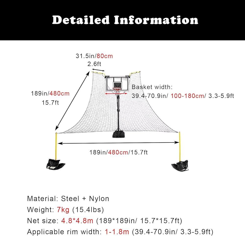 Fits the Size of the Basketball Board --- Basketball Hoop Ball Return Net size is 4.8*4.8 m (189*189in/15.7*15.7ft) suitable for all basketball hoops with basketball board width of 1 - 1.8m (39.4-70.9in/3.3-5.9ft).