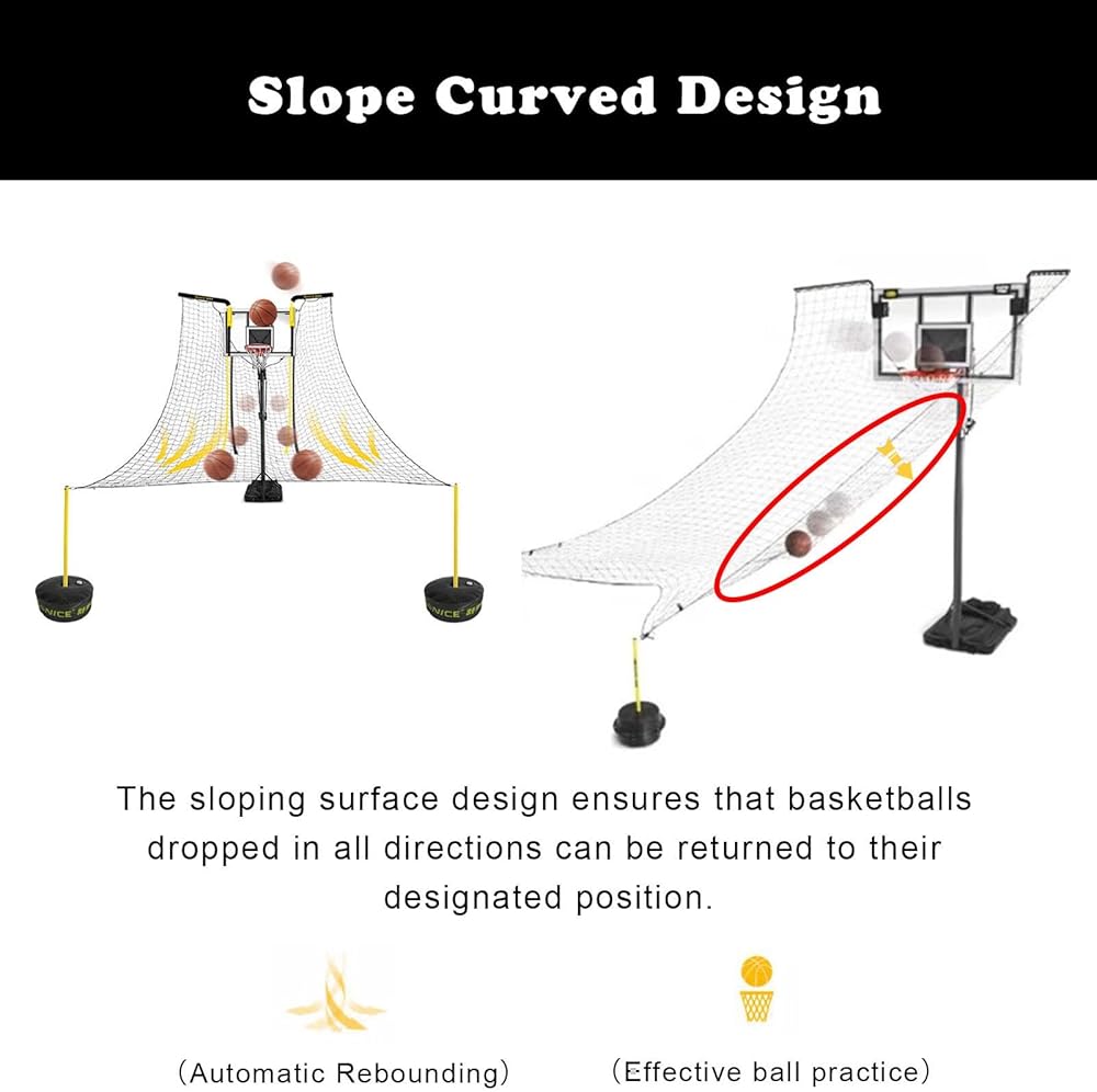 Slope Curved Design --- The upgraded basketball hoop ball return net features a sloped curved design to maximize the ability of falling basketballs in all directions to automatically return to their designated locations.