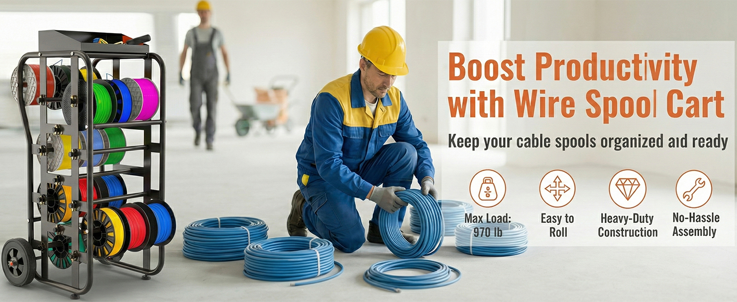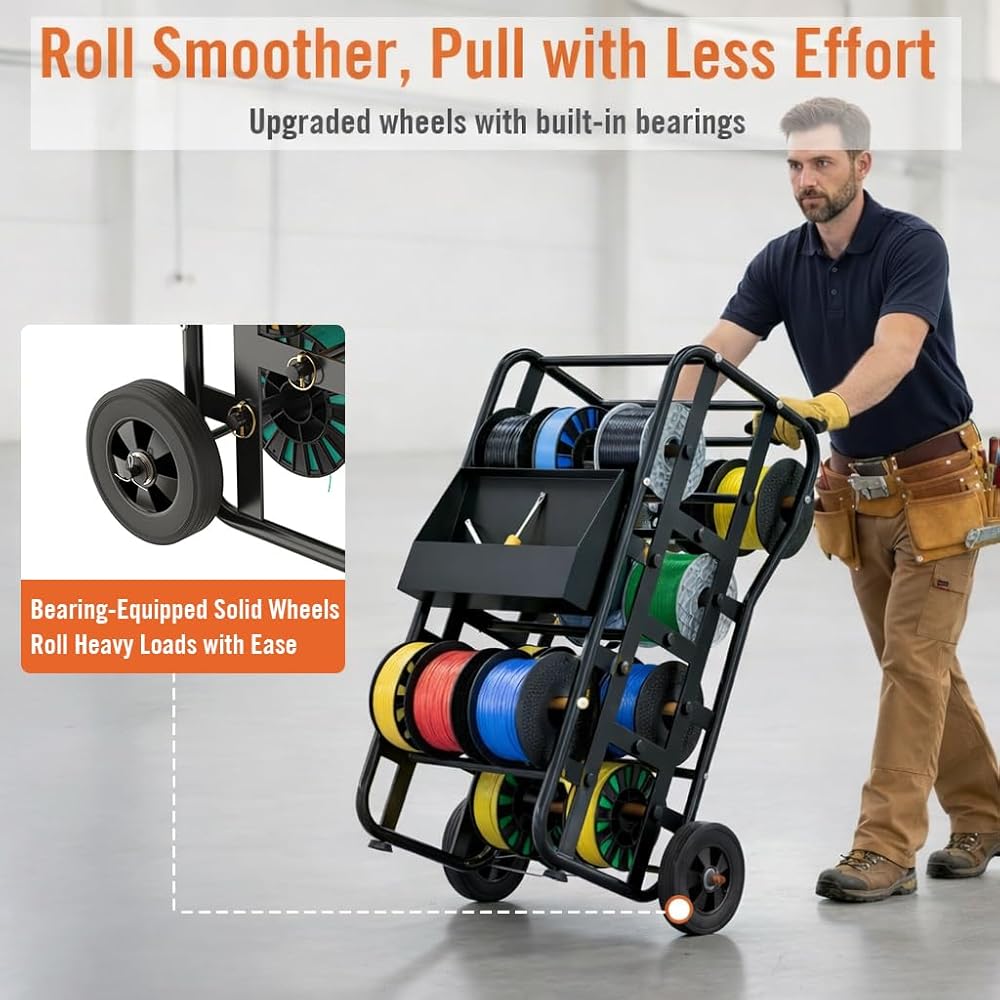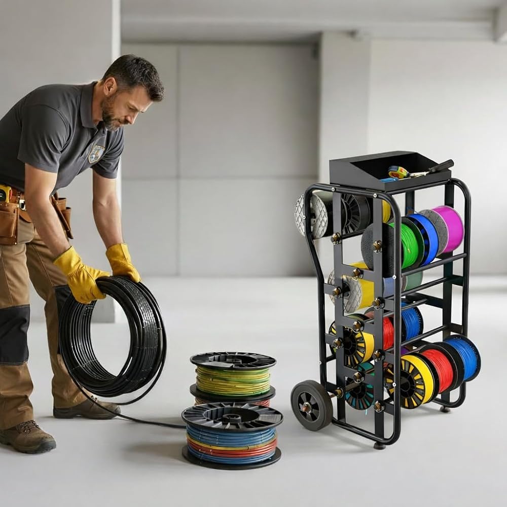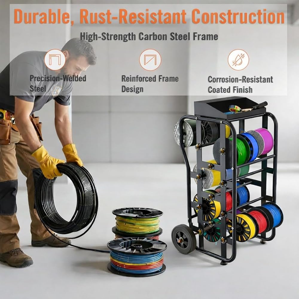 رف بكرة سلكية بعجلات، علبة كابلات شديدة التحمل ومنظم موزع الأسلاك، قضبان قابلة للتعديل، سعة كبيرة، صندوق أدوات، عربة متنقلة للكهربائيين، ورشة عمل ومستودع، 38 بوصة × 21.2 بوصة، أسود