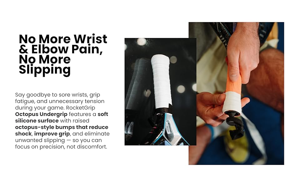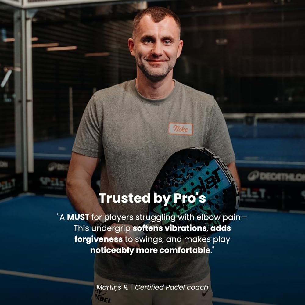 🐙 راحة تقلل الاهتزاز - استمتع بتجربة كل طلقة بضغط أقل. تعمل بطانة السيليكون الناعمة في RocketGrip Octopus Padel Undergrip على امتصاص الصدمات وتقليل إجهاد المعصم، مما يجعل من السهل اللعب لفترة أطول دون إزعاج - وهو أمر ضروري للاعبي البادل الجادين.