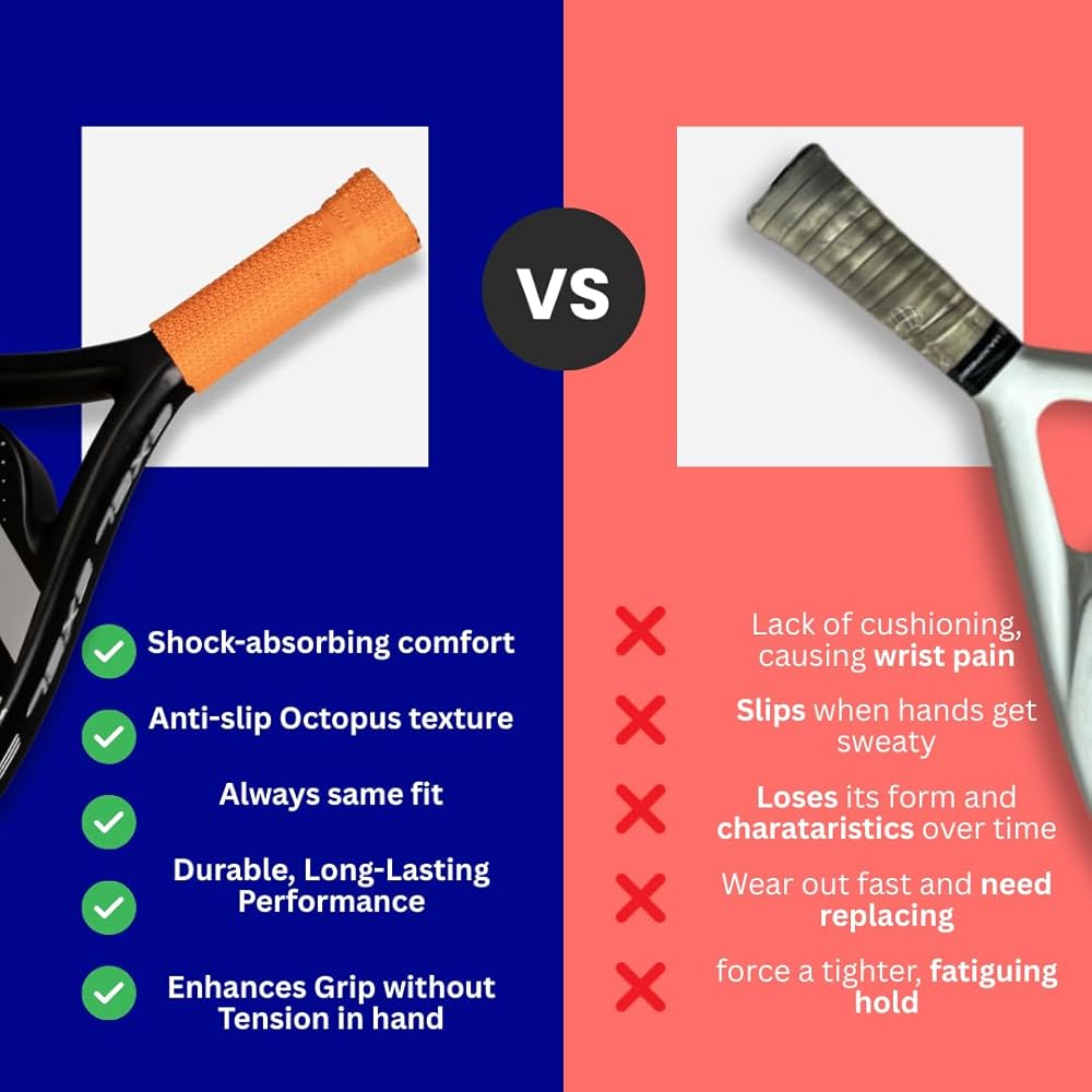 🎾 ملاءمة عالمية - ينزلق المقبض السفلي للأخطبوط باديل بسهولة على مقبض المضرب. مقاس واحد يناسب جميع مضارب الباديل القياسية - لا حاجة للقطع أو التعديل.