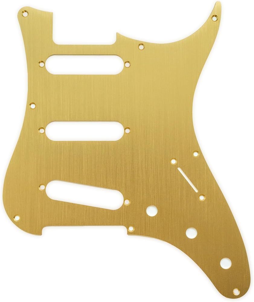 A single-ply gold anodized aluminum pickguard for PRS SE Silver Sky electric guitars. Brushed finish. Back plate (tremolo cover) and mounting screws included.