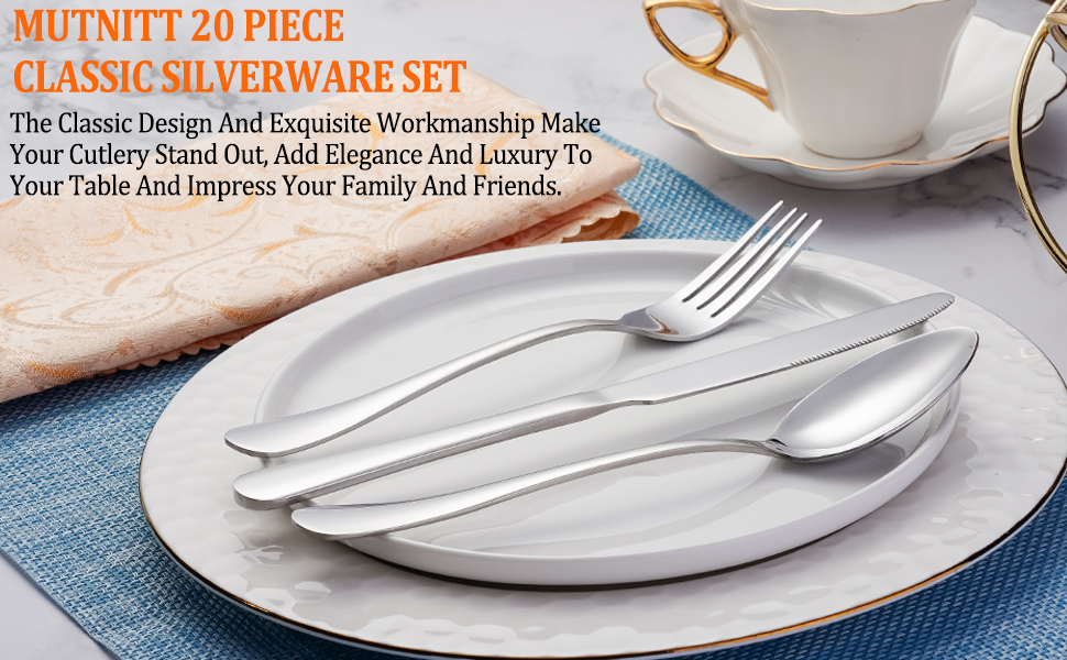 مجموعة أدوات فضية مكونة من 20 قطعة خدمة لـ 4: تأتي مجموعة أدوات المائدة الفضية هذه مع 4 شوكات عشاء، و4 ملاعق عشاء، و4 سكين عشاء، و4 شوكة سلطة/حلوى، و4 ملاعق حلوى/شاي، وهي ضرورية للعائلات أو المطاعم. تعتبر المجموعة أيضًا أداة طعام لا يمكن الاستغناء عنها سواء كانت للاستخدام اليومي أو لإعداد العشاء أو الحفلات.