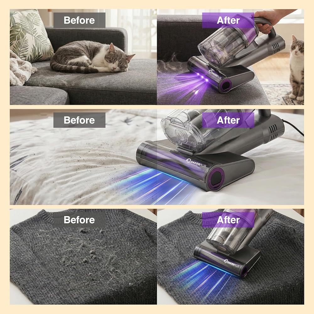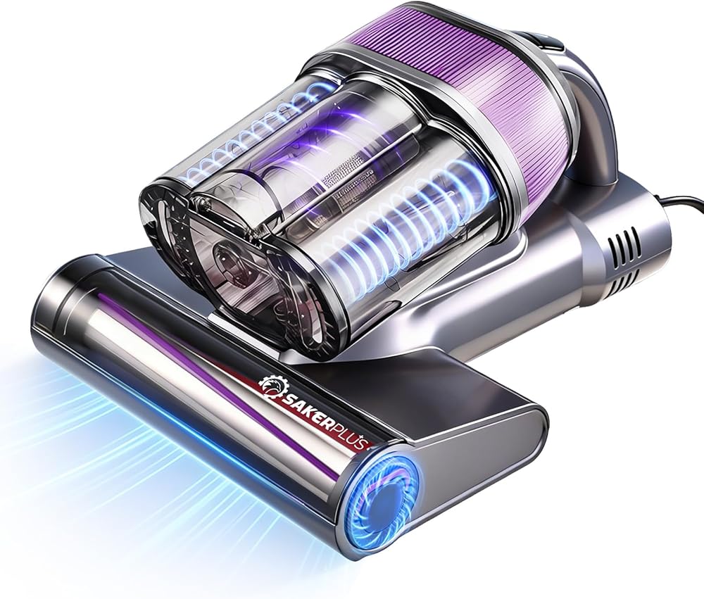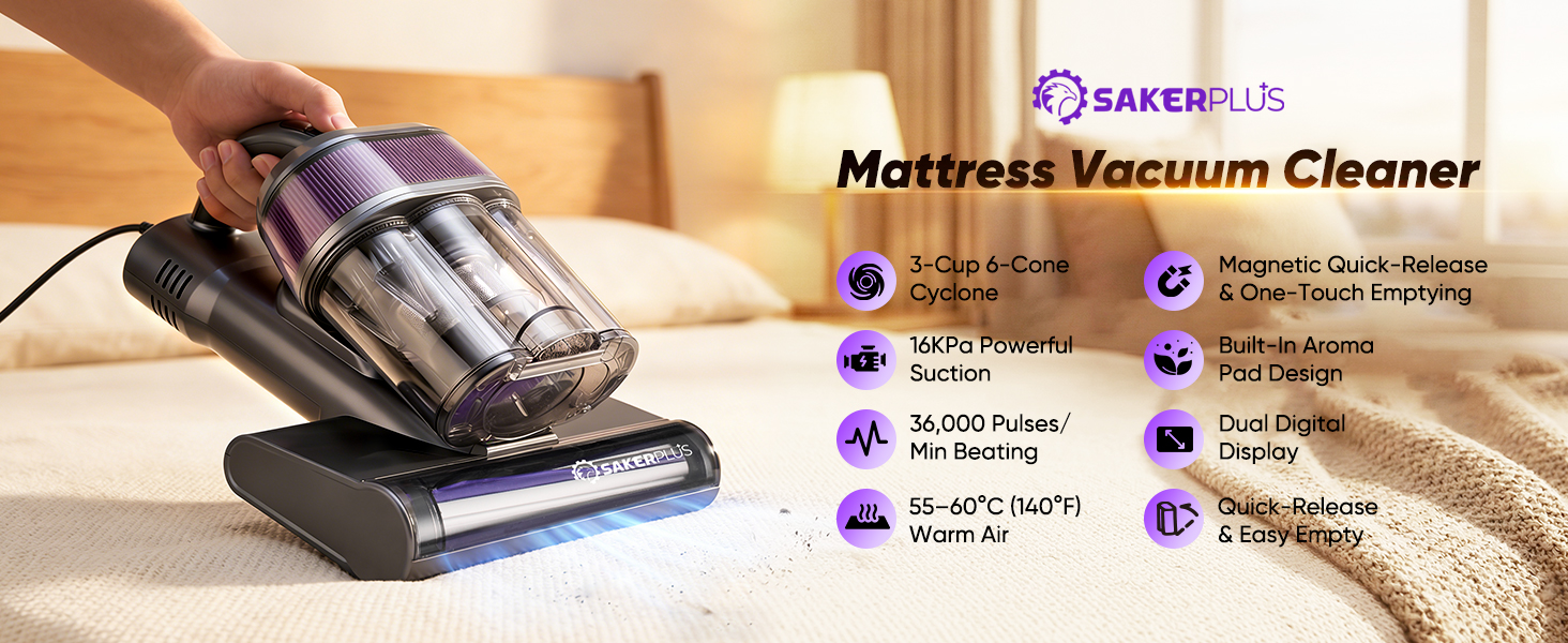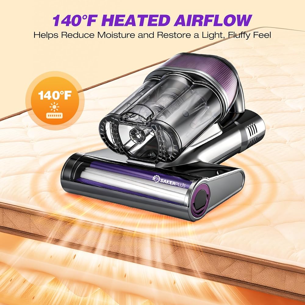 مكنسة كهربائية قوية للسرير من SakerPlus، مكنسة كهربائية للمرتبة 16 كيلو باسكال مع 36000 نبضة/الدقيقة و140 درجة فهرنهايت هواء دافئ، نظام إعصار 3 أكواب، شاشة ذكية، مكنسة كهربائية محمولة لشعر الحيوانات الأليفة على أريكة السرير