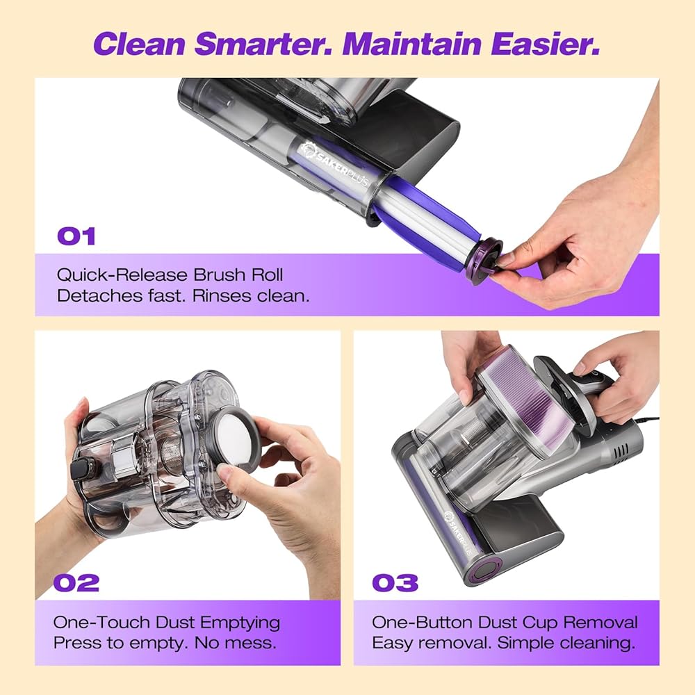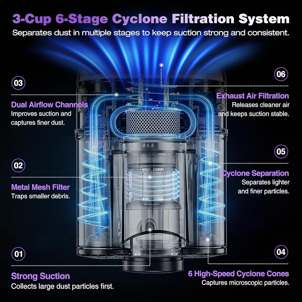 • نظام إعصاري متطور مكون من 3 أكواب و6 مخروط: تم تصميمه بهيكل إعصاري متعدد المراحل، حيث يفصل هذا النظام الغبار خطوة بخطوة للمساعدة في الحفاظ على الشفط القوي وتقليل الانسداد. باعتبارها منظفًا موثوقًا للمراتب، تحافظ مكنسة Sakerplus على تدفق هواء ثابت وتلتقط الجزيئات بشكل أكثر فعالية لتنظيف يومي سلس ومتسق.