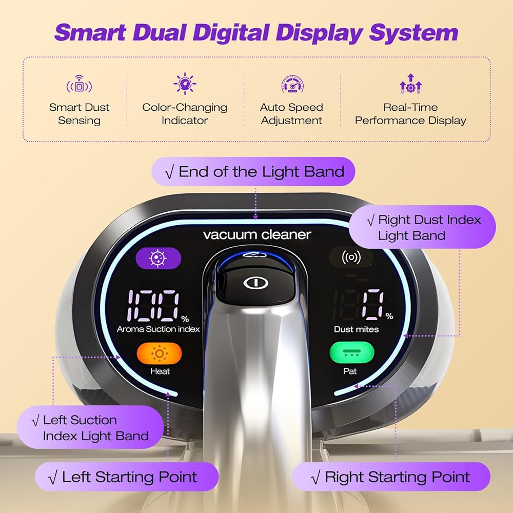 • شاشة رقمية ذكية مع التحكم في الوقت الحقيقي: تعرض الشاشة الذكية مؤشر الشفط ومؤشر الغبار ومؤشرات الضوء الديناميكية من الأزرق إلى الأحمر في الوقت الفعلي للحصول على تجربة تنظيف أكثر سهولة. باعتبارها مكنسة سرير سريعة الاستجابة، تعمل ماكينة تنظيف المرتبة Sakerplus تلقائيًا على ضبط سرعة المحرك بناءً على مستويات الغبار المكتشفة، مما يمنحك ثقة بصرية أثناء التنظيف