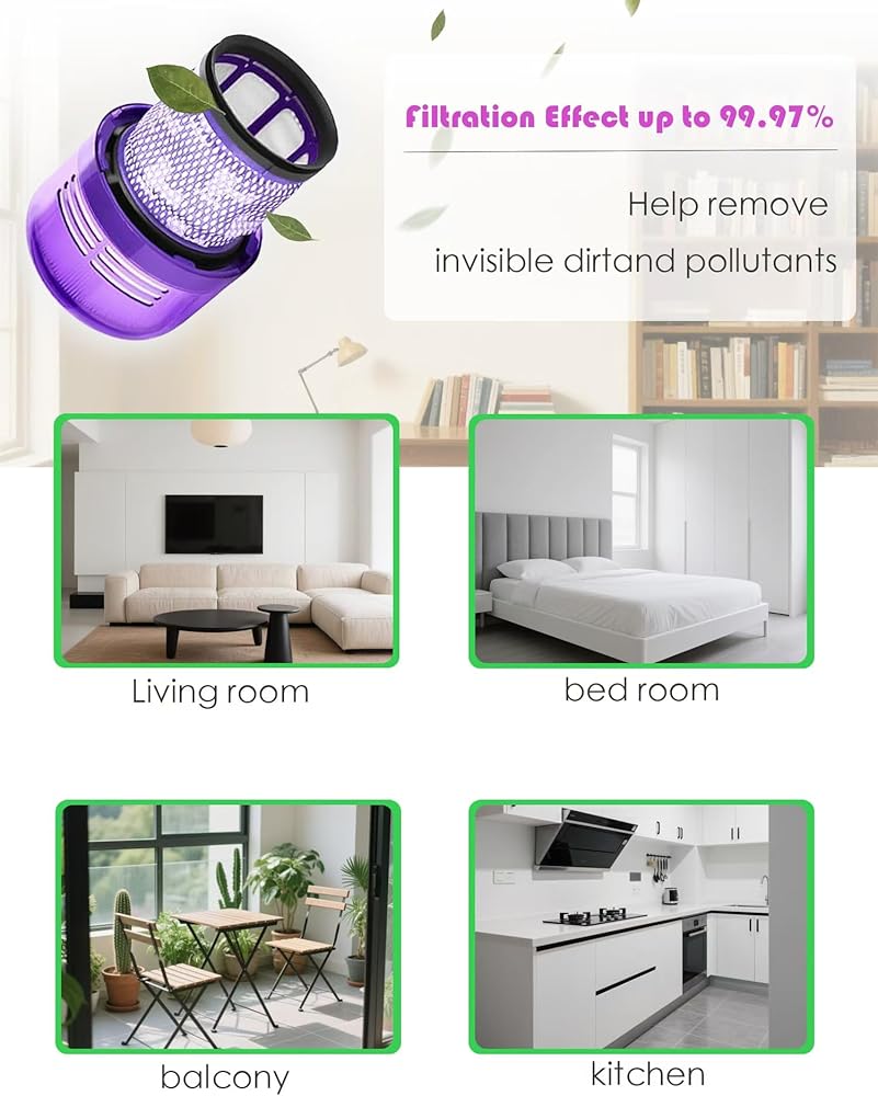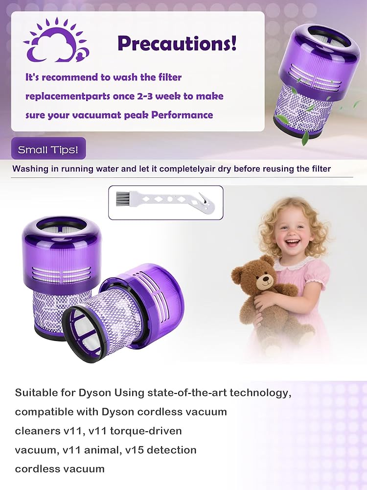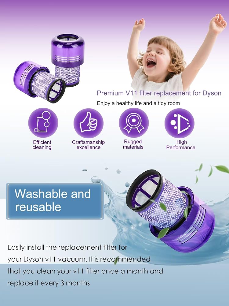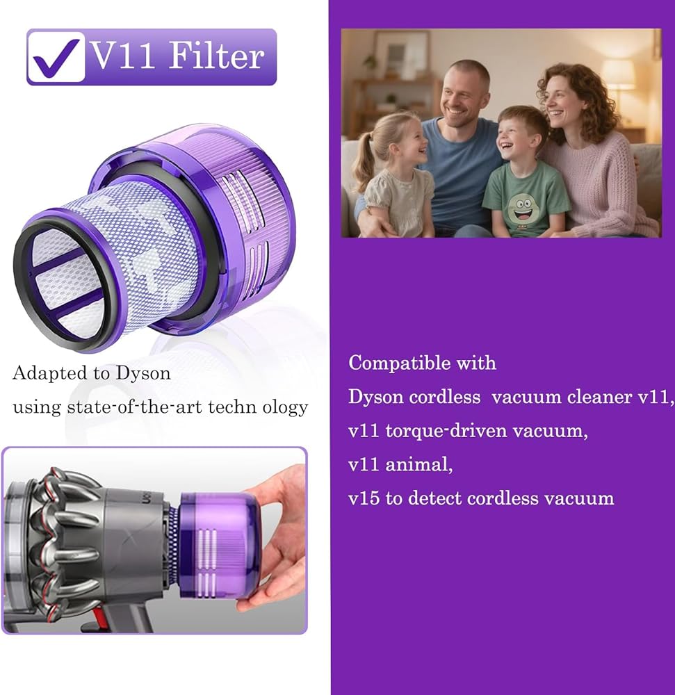 Suitable for Dyson V15/V11/SV14 cordless vacuum with this premium replacement filter. The sleek purple filter element features a sophisticated mesh design that efficiently captures dust and dirt particles, helping to maintain optimal suction power. Measuring 5.1 inches in height and 3.5 inches in diameter, this filter is precisely engineered to fit your vacuum model. The easy-to-install design allows for quick replacement when needed, while the durable construction helps extend the life of your HEPA filter and protects your vacuum's motor. The filter includes a convenient cleaning brush for maintenance. Its compact size and efficient filtration system make it an essential accessory for maintaining your vacuum's performance. Regular replacement helps ensure consistent cleaning power and maintains the air quality in your home. Compatible with Dyson V15, V11, and SV14 models, this filter element is designed for reliable, long-lasting performance.
