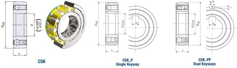 CSK..P has the same construction and outside dimensions as type CSK, but has a keyway on the inner race. These clutches can be mounted on a shaft to k6 tolerance. The outer race must be pressed into a rigid housing to N6 tolerance.