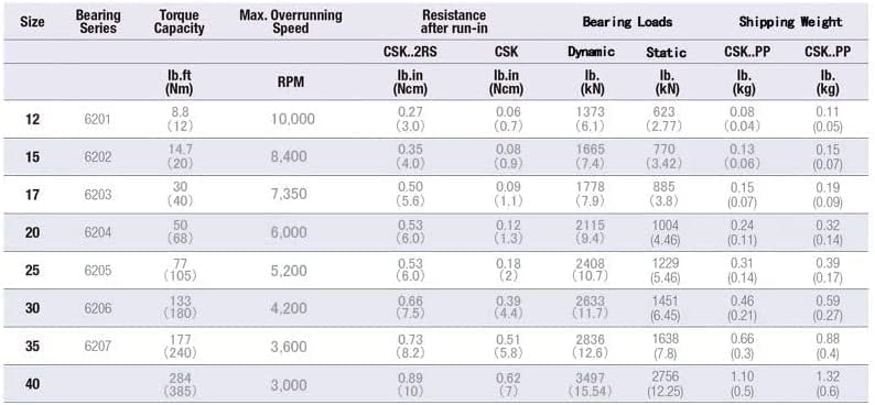 Type CSK is a sprag type clutch integrated into a 62 Series ball bearing (except sizes 8 and 40). It is bearing supported, shipped grease lubricated and protected against dust larger than .012" (.3mm) diameter. The use of additional "nylon" type seals is recommended especially when the working temperature exceeds 122°F (50°C).