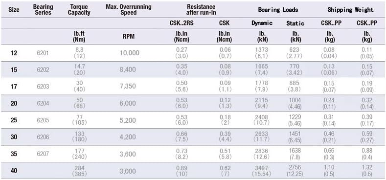 Type CSK is a sprag type clutch integrated into a 62 Series ball bearing (except sizes 8 and 40). It is bearing supported, shipped grease lubricated and protected against dust larger than .012" (.3mm) diameter. The use of additional "nylon" type seals is recommended especially when the working temperature exceeds 122°F (50°C).