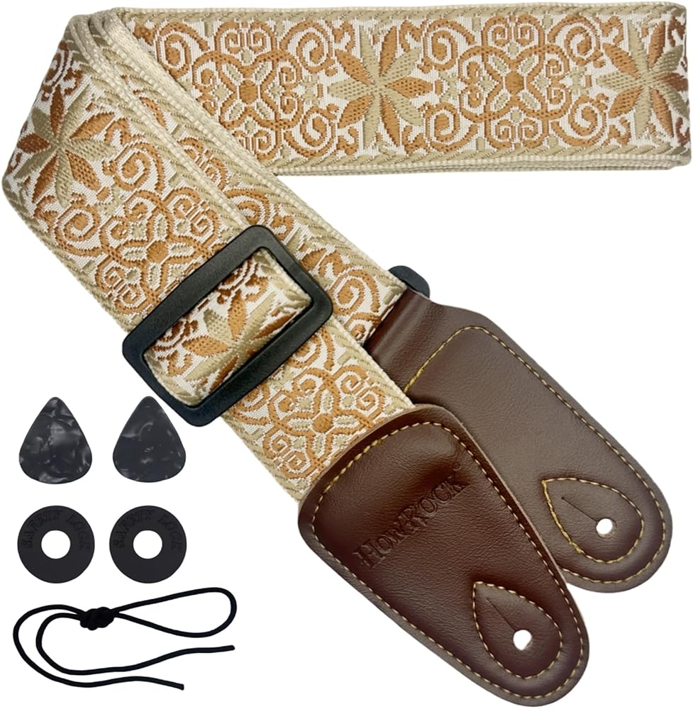 Premium Guitar Strap - Durable 3D cotton & leather construction with comfortable 2" wide, 2mm thick design. Adjustable (34" - 58") with secure carbon slider. Stylish colorful brown orange yellow maillard series color embroidery. Fits all guitars (acoustic/ electric/ bass/ ukulele). Includes 1 guitar strap, 2 gaskets, 2 picks & 1 headstock rope