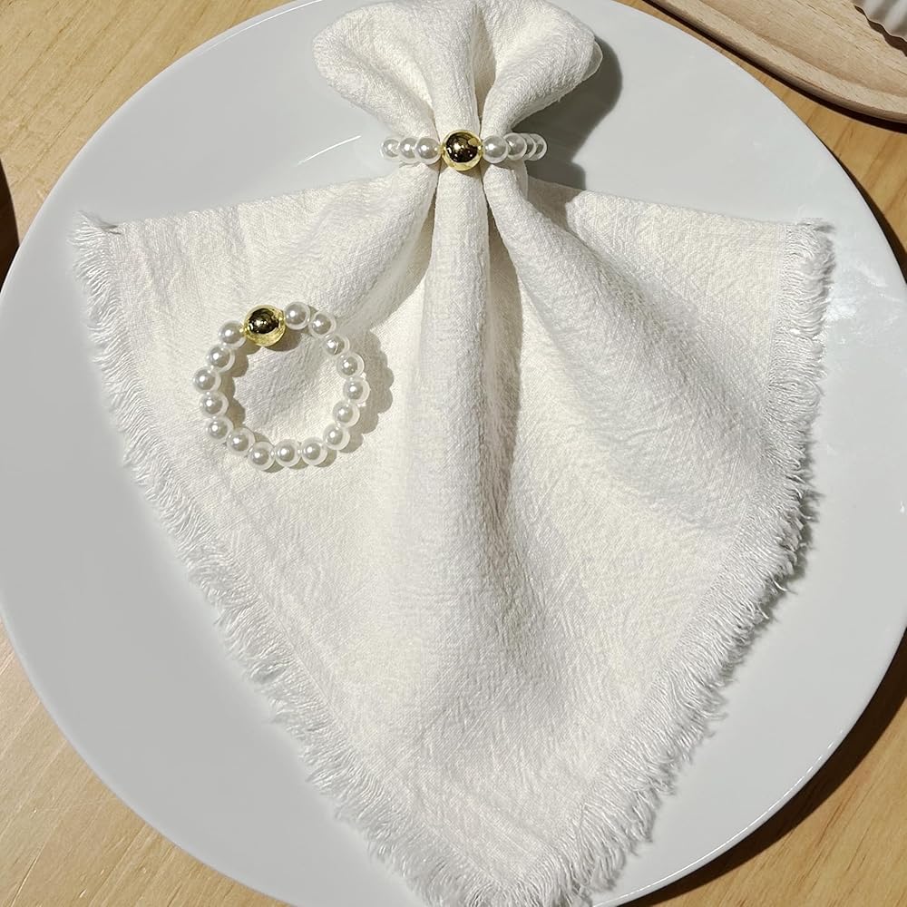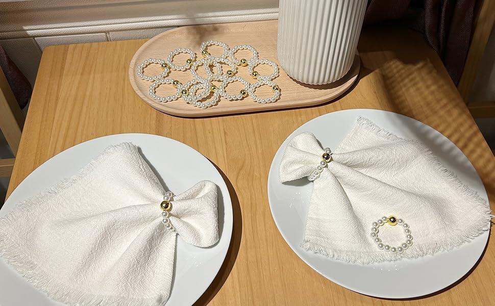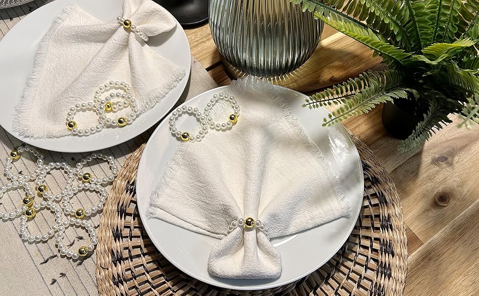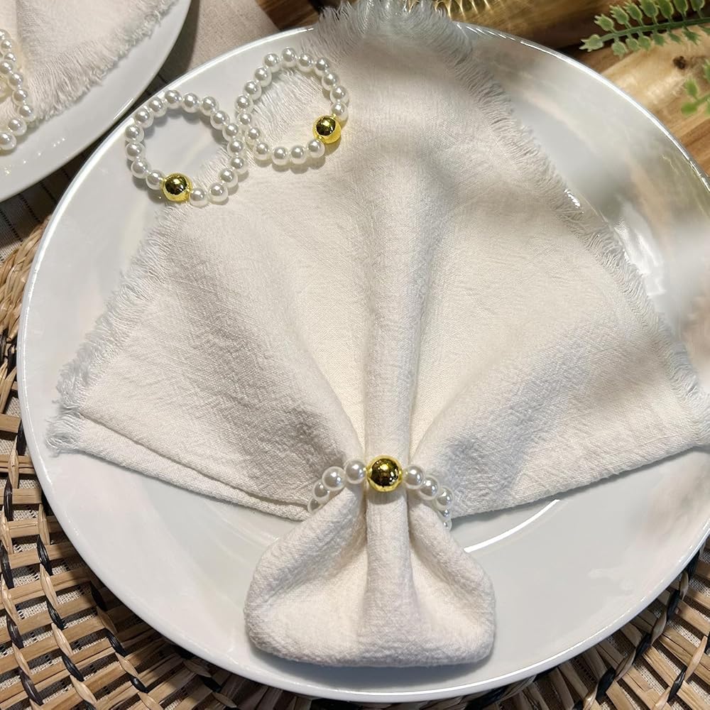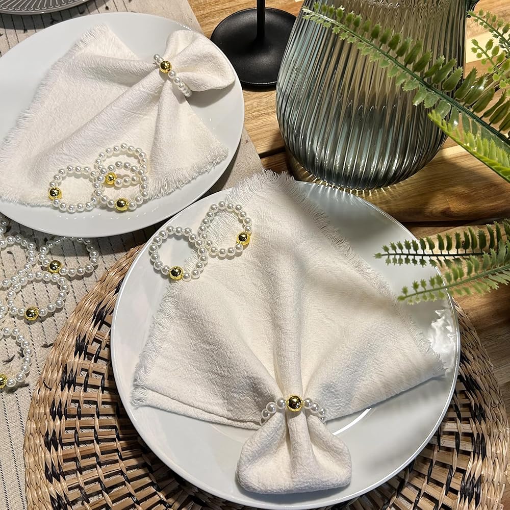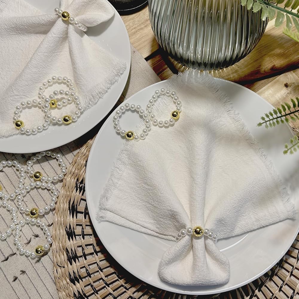 حلقات مناديل بيضاء مع لمسات ذهبية: لوحة ألوان محايدة تكمل أي ديكور للطاولة. تتميز بأشرطة لؤلؤية قابلة للتمدد مع خرزة ذهبية رقيقة في المنتصف، مما يضفي لمسة من الرقي الخالد