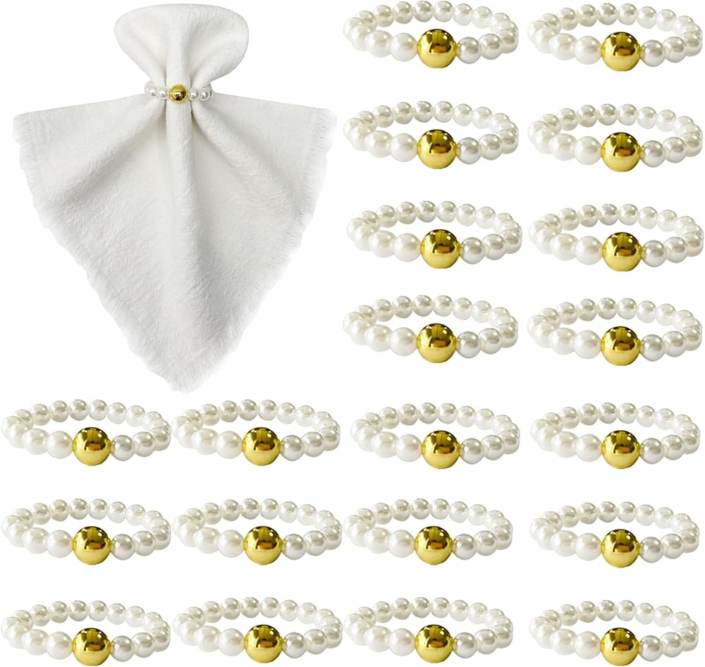 تصميم لؤلؤي وذهبي ذو مغزى: كل حلقة مناديل لؤلؤية مرنة مزينة بخرزة ذهبية في المنتصف، مما يخلق تذكارًا رقيقًا وأنيقًا لذكرى أو احتفال