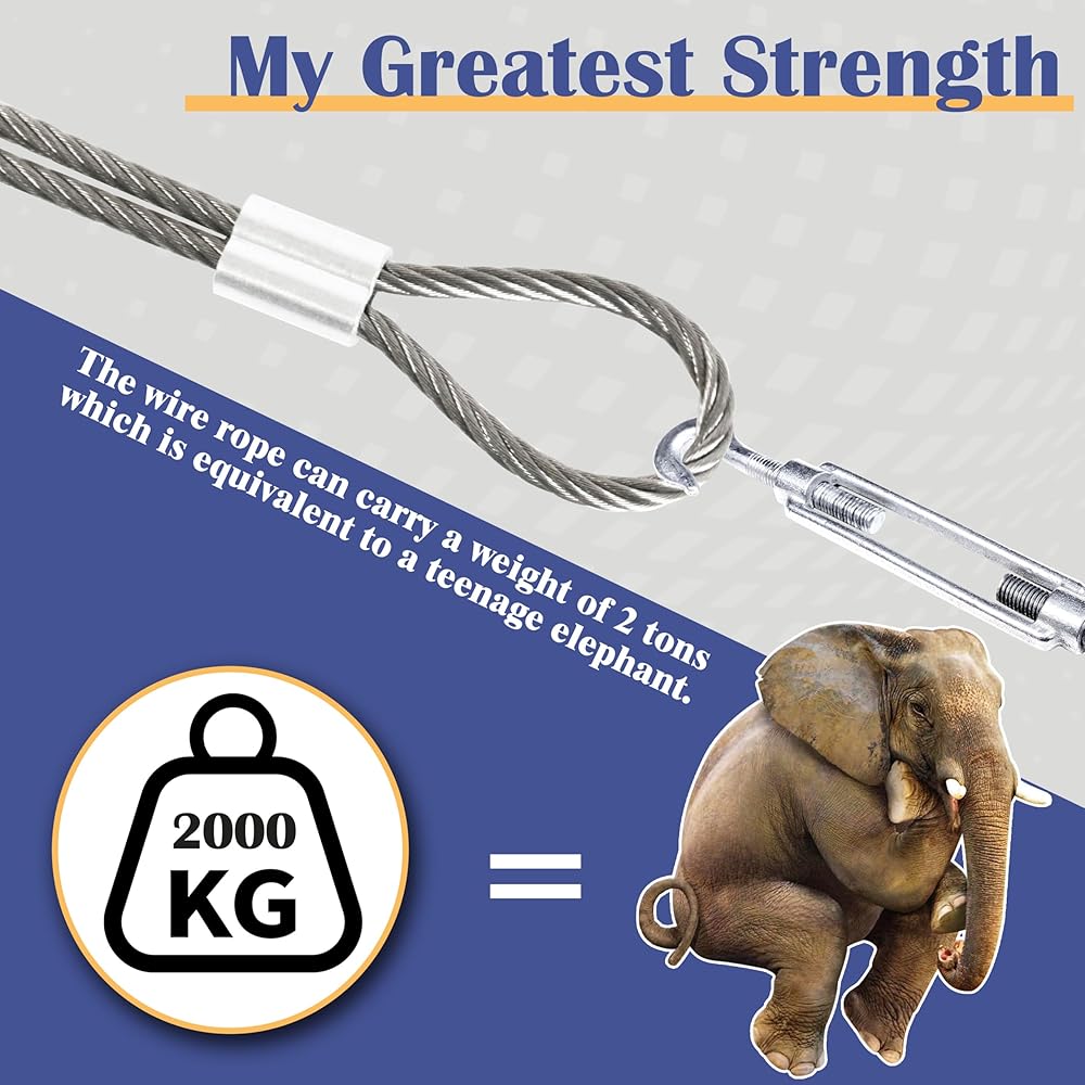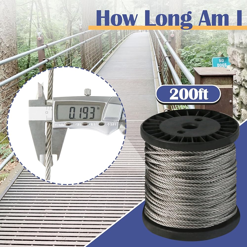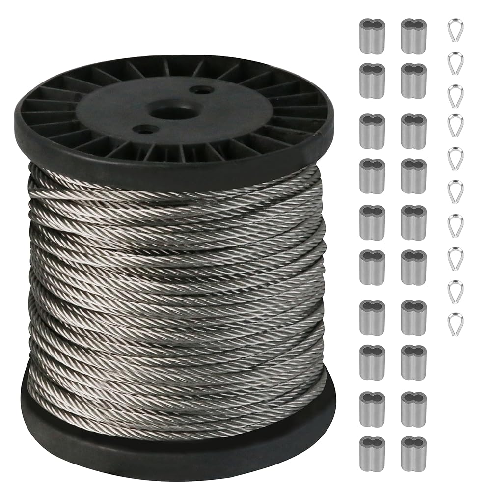 【 قائمة التعبئة والتغليف: تتضمن كابل سلك مطلي بالبولي فينيل كلوريد بقطر 60 متر/200 قدم 1/5 بوصة، 20 قطعة M2 حلقة تجعيد من الألومنيوم و10 قطع مرساة حائط