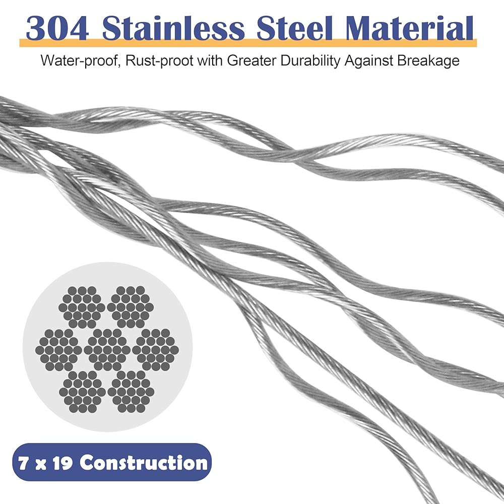 【حبل سلكي عالي القوة 1/5】يبلغ القطر الخارجي العاري للكابل المصنوع من الفولاذ المقاوم للصدأ 3 مم، بينما يبلغ القطر الخارجي المطلي 2 مم. يتميز ببناء 7X19 ويتميز بقوة كسر مذهلة تصل إلى 4500 رطل. متانة هذا السلك تجعله مناسبًا لمختلف التطبيقات، بما في ذلك تركيبات الانزلاق، وتعليق أضواء الخيط، ومشروعات القضبان.