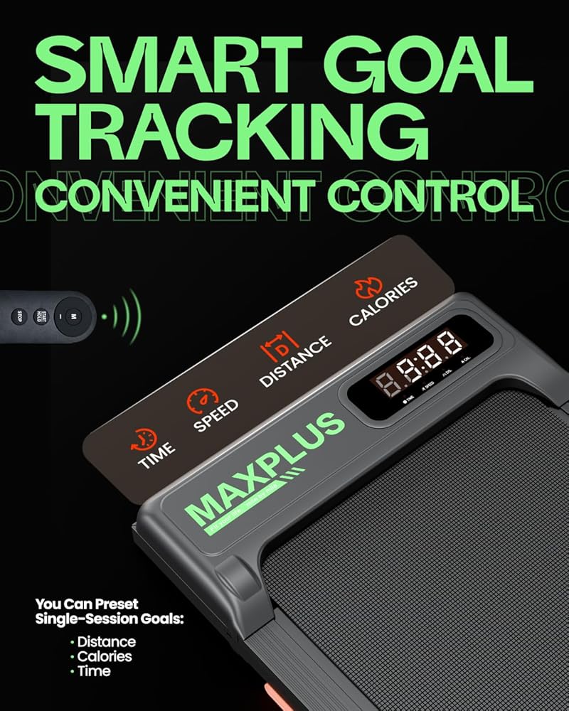 حامل كمبيوتر لوحي مدمج وتحكم ذكي: ابق مستمتعًا ومتصلاً! يتميز المقود القابل للطي بحامل كمبيوتر لوحي آمن ومحكم - مثالي لمشاهدة مقاطع الفيديو أو الانضمام إلى المكالمات أو تتبع التطبيقات دون استخدام اليدين. تحكم في كل شيء عبر جهاز التحكم عن بعد: اضبط السرعة، وحدد الأهداف (الوقت/المسافة/السعرات الحرارية)، وراقب الإحصائيات (السرعة/الوقت/المسافة/السعرات الحرارية) على شاشة LED.