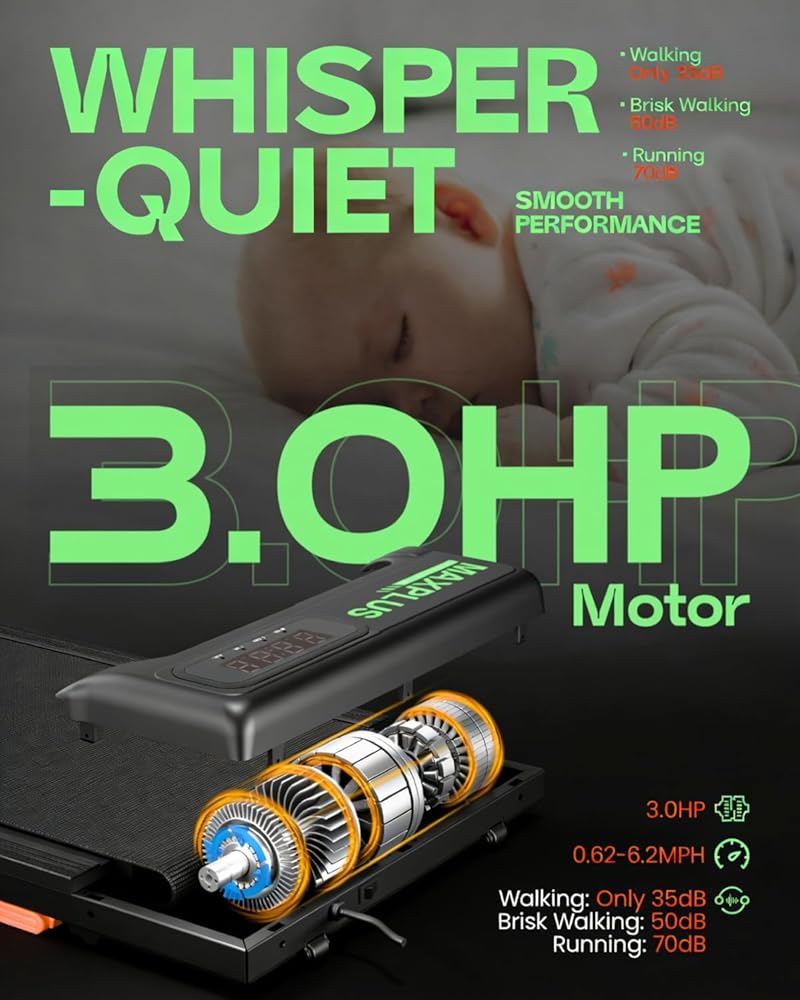 محرك صامت بقوة 3.0 حصان وتشغيل سلس: استمتع بالمشي أو الركض بدون تشتيت الانتباه (0.62 - 6.2 ميل في الساعة) مدعوم بمحرك قوي بقوة 3.0 حصان يعمل بأقل من 40 ديسيبل - أكثر هدوءًا من المحادثة الهامسة! تدعم أجهزة المشي المحمولة للمنزل هذه بثقة المستخدمين الذين يصل وزنهم إلى 350 رطلاً مع ثبات خالٍ من الاهتزاز، وهي مثالية للمكاتب المنزلية أو المساحات المشتركة.