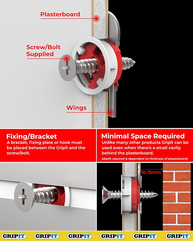براغي قابلة للإزالة وإعادة الاستخدام مثالية لتركيبات الحائط Dot and Dab. مناسبة لجميع أنواع ألواح الجبس (1/2 بوصة إلى 5/8 بوصة) دون الحاجة إلى عوارض أو نقاط تثبيت إضافية. كما أنه يعمل على أنواع ألواح الجبس المعزولة.