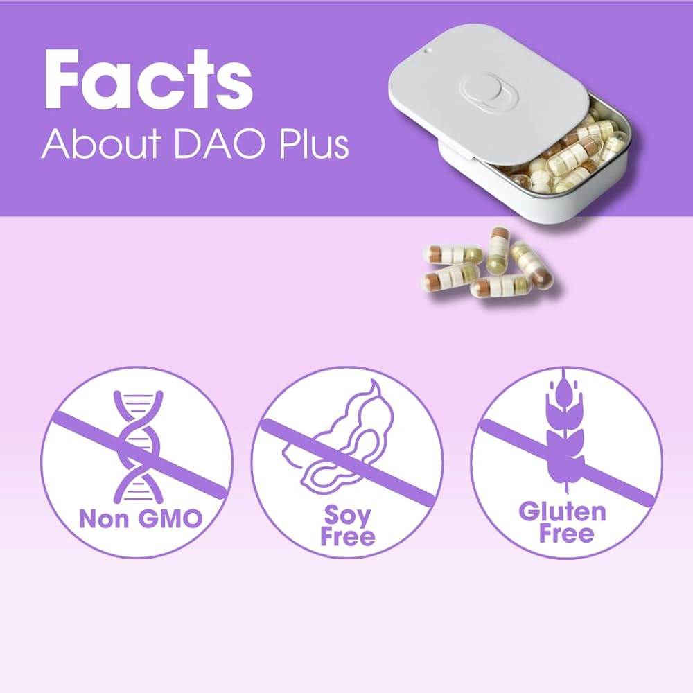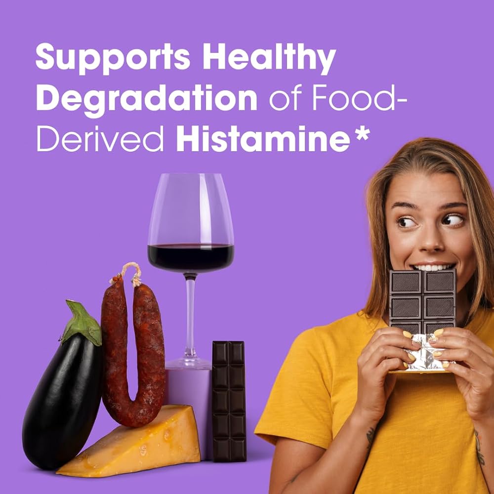 مكمل ديامين أوكسيديز (DAO) عالي الجودة - تحتوي كل كبسولة على 0.3 مجم من إنزيم DAO لدعم قدرة جسمك على تحطيم الهستامين من الطعام واستعادة التوازن الطبيعي لـ DAO والهستامين في القناة الهضمية.