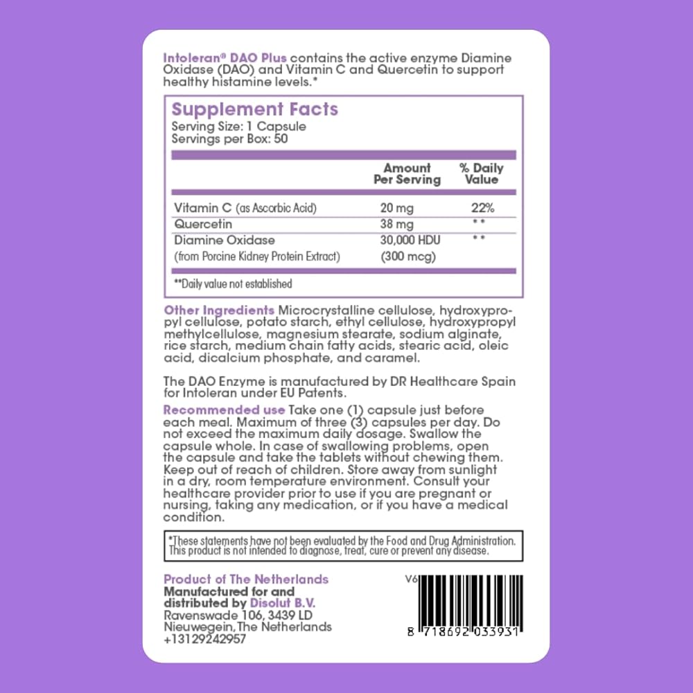 Intoleran DAO Plus الإنزيمات الهاضمة - 50 كبسولة | ملحق لعدم تحمل الهيستامين ونقص DAO | مستويات الهستامين الصحية | 30.000 HDU ديامين أوكسيديز (DAO) إنزيم | فيتامين ج وكيرسيتين