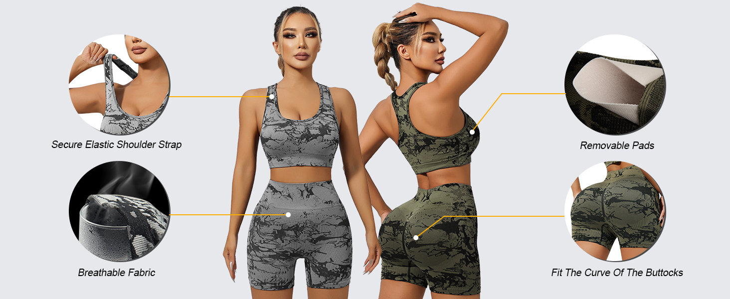 【إخفاء بقع العرق وحواف الملابس الداخلية】تصميم النمط المموه لمجموعات اليوغا الرياضية لا يظهر الأوساخ. فهو لا يمتص جميع بقع العرق ويجعل من الصعب ملاحظتها فحسب، بل يخفي أيضًا التجاعيد الصغيرة في الملابس الداخلية والملابس الداخلية بشكل جيد للغاية، مما يمنعك من الشعور بالحرج ويسمح لك بالتركيز على تمرينك