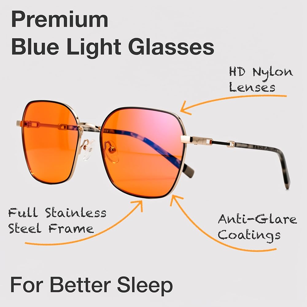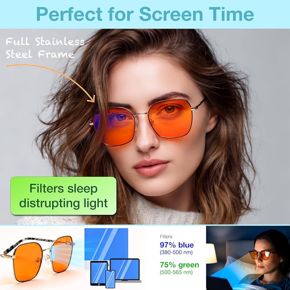 نظارات برتقالية زرقاء تحجب الضوء للنساء والرجال - تقاوم تدفق الضوء المعطل للهرمونات الذي يدمر راحتك؛ تقوم نظارات الضوء الأزرق الخاصة بك بتصفية 97% من الضوء الأزرق من أجل نوم أفضل بشكل طبيعي؛ لديهم إطار كامل من الفولاذ المقاوم للصدأ؛ الراقية ولكن بأسعار معقولة