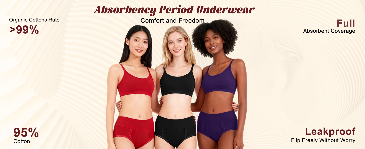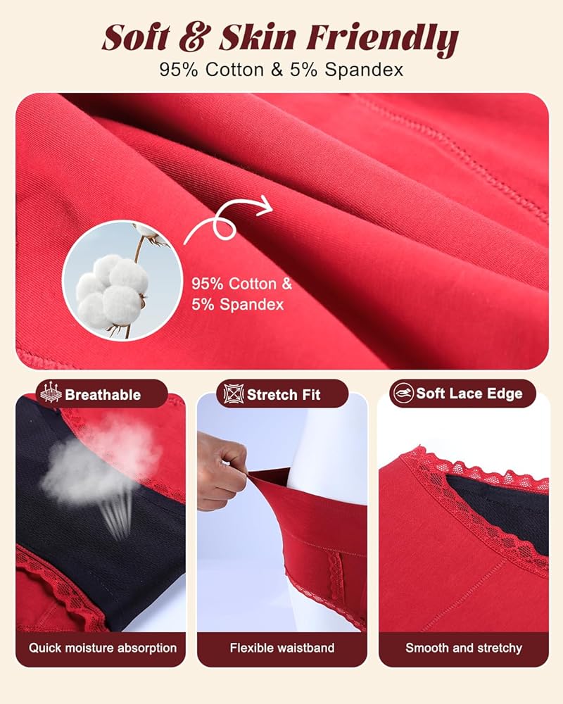 Made from 95% cotton and 5% spandex, our period underwear for women stretch comfortably with your body, while the lace trim design adds a touch of feminine elegance. Breathable, flexible, and discreet under clothing — you'll forget you're wearing protection at all.