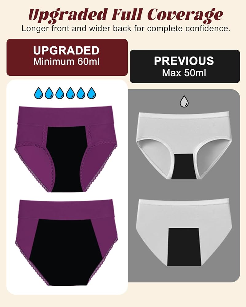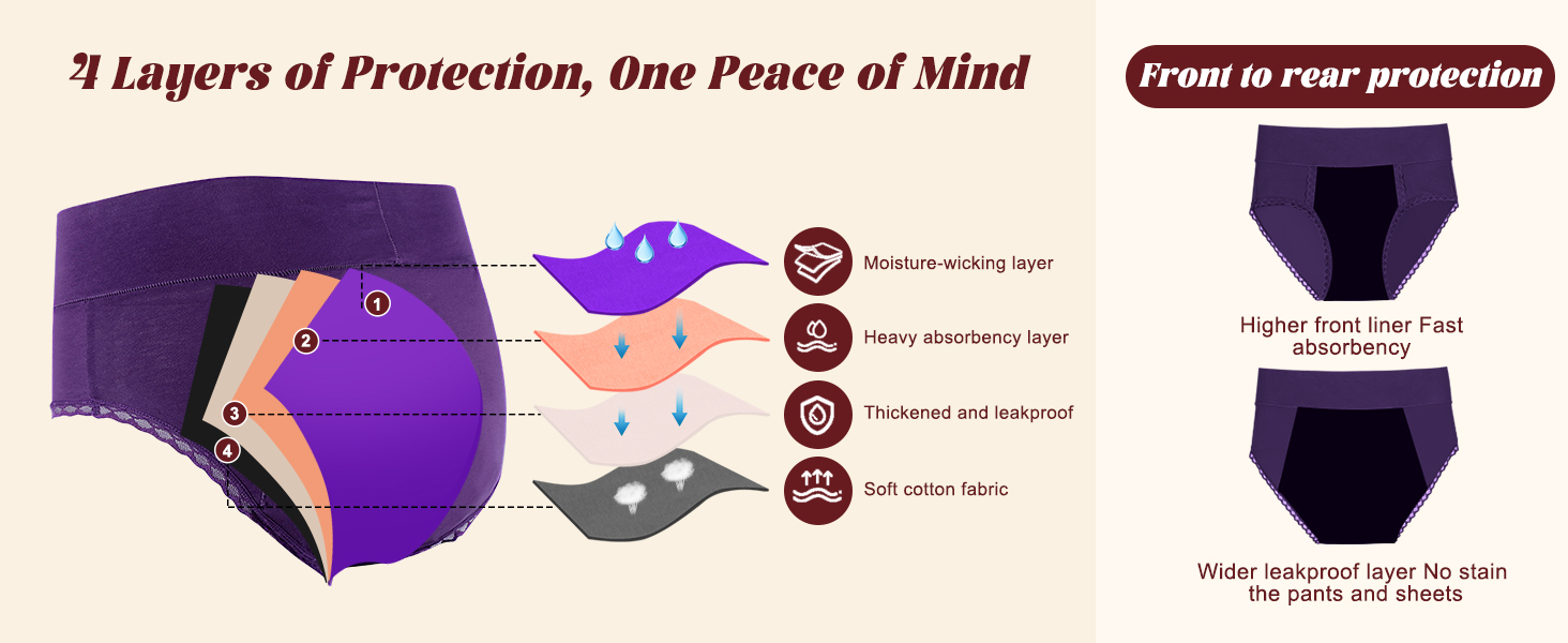Each pair features 4 advanced layers: a moisture-wicking surface to keep you dry, a heavy absorbency core to lock in liquid, a PU waterproof membrane for leak defense, and a soft cotton outer layer that feels gentle on your skin. The upgraded longer front and wider back panel offer full coverage, so you stay protected in any position — day or night.