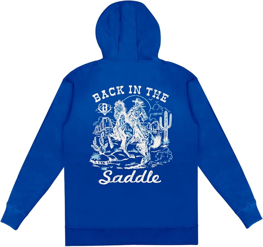 Mens pullover hoodie built for baseball players and everyday western style. Back in the Saddle graphic brings cowboy work ethic to the diamond for offseason training, cages, and casual wear. Full length sleeves and regular fit keep you comfortable from the cage to the couch.