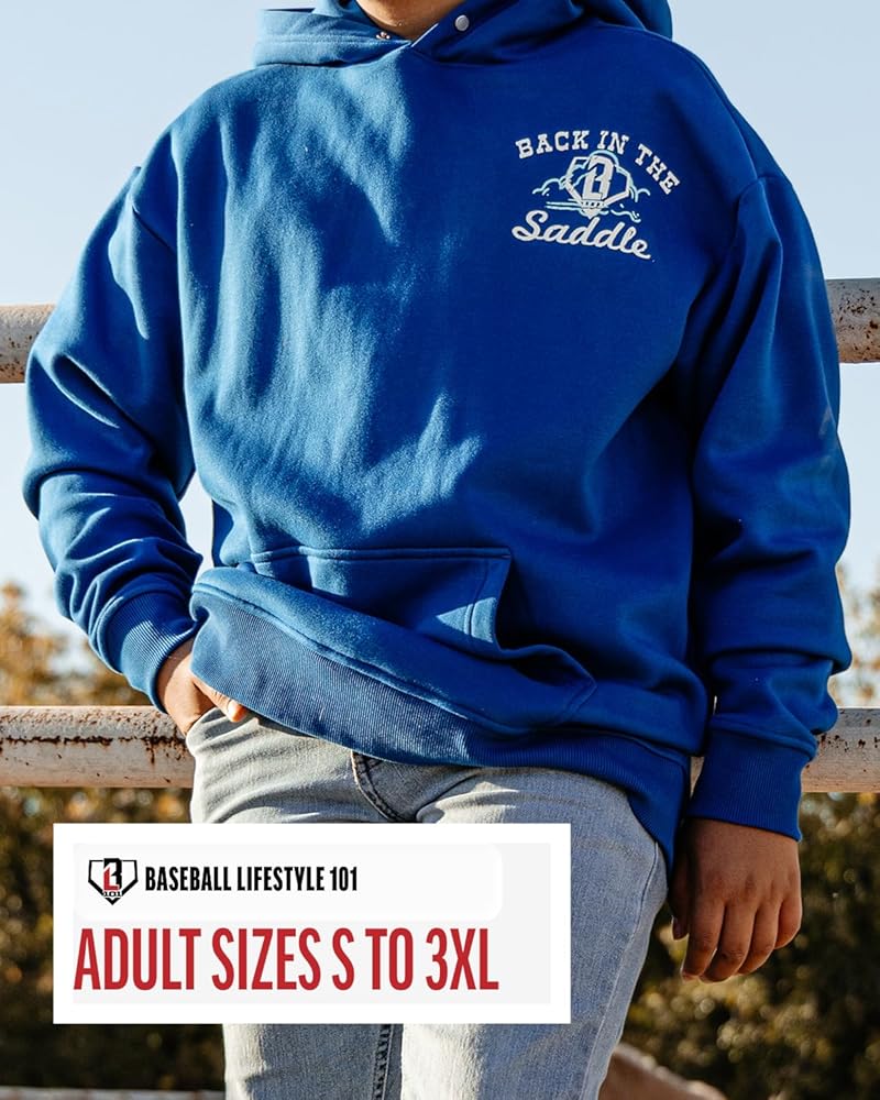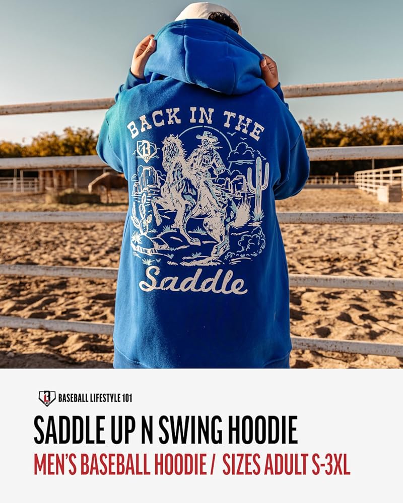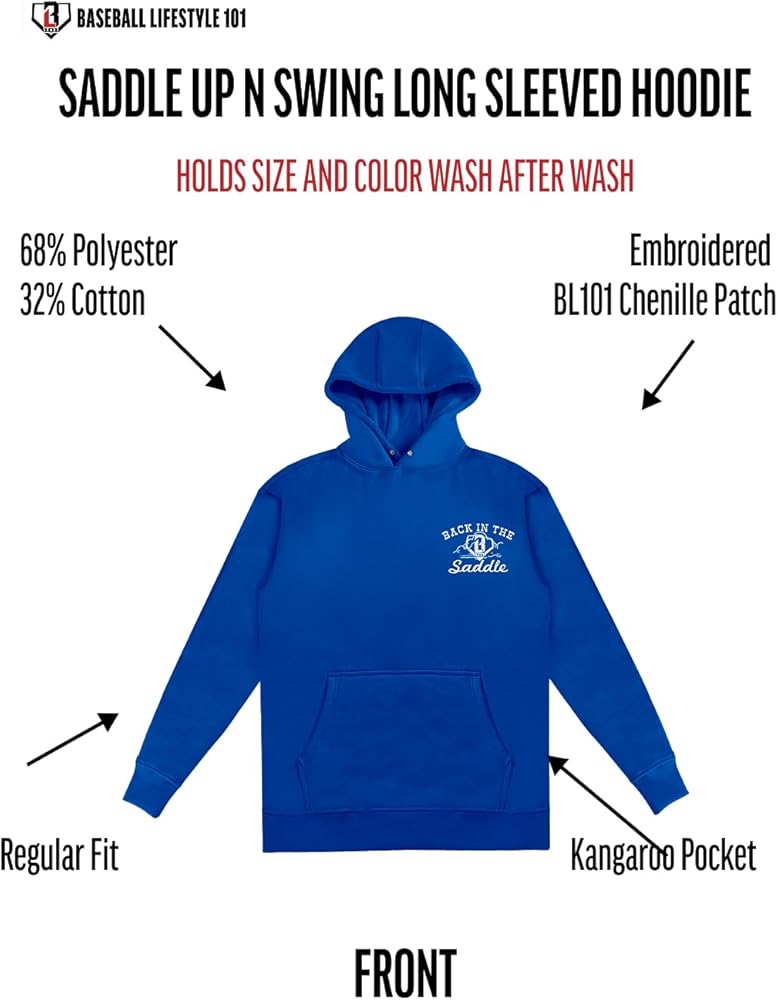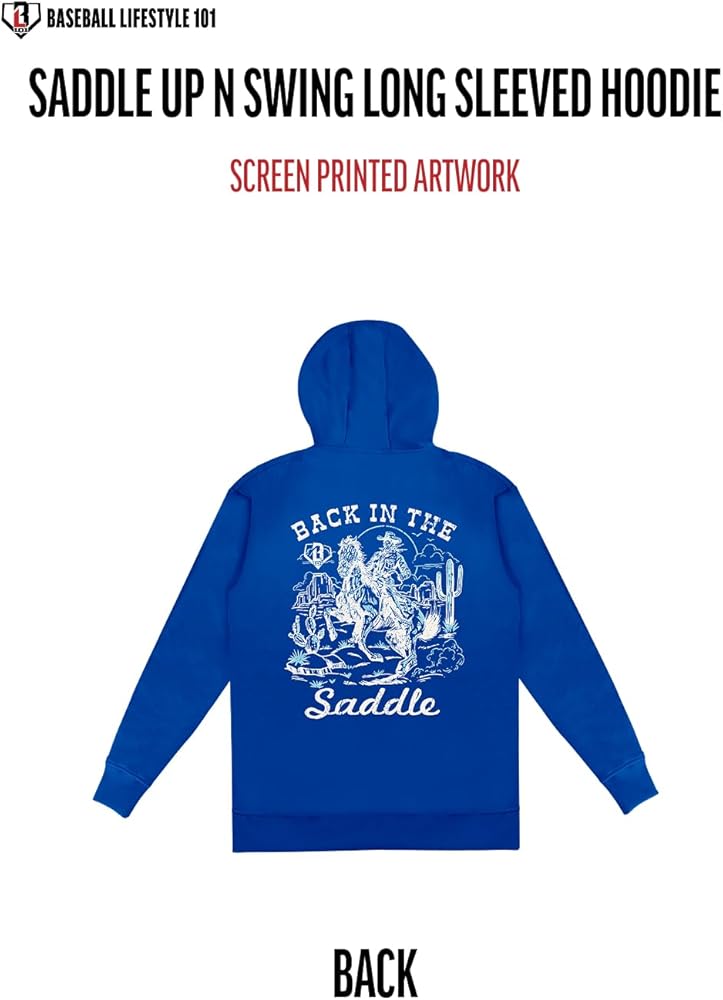 The BL101 Saddle Up N Swing Hoodie brings that cowboy work ethic to the diamond. "Back in the Saddle" graphic on the back with a classic western scene reminds you to get back to the fundamentals.When the season ends and most players head home, real ones saddle back up and get to work. Whether it's the cage, the field, or just staying ready between reps, this hoodie keeps you in that offseason grind mode.